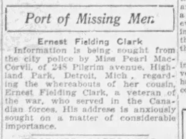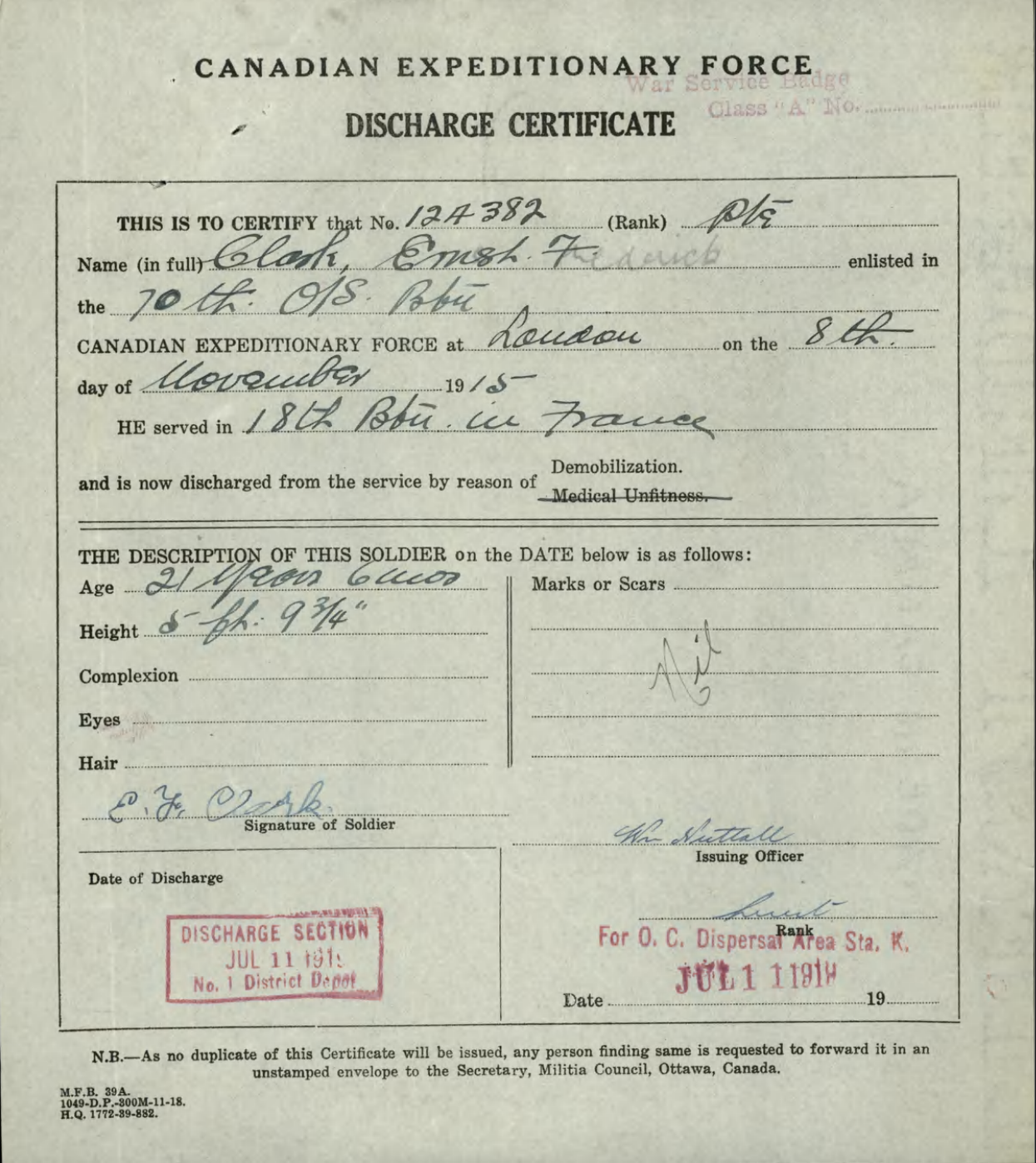 Family Search: When Private Ernest Fielding Clark was born on 27 September 1897, in Huron, Ontario, Canada, his father, Daniel Frances Clark, was 24 and his mother, Elizabeth Ann McConnell, was 20. He lived in London, Ontario, Canada in 1919 and Stratford, Perth, Ontario, Canada in 1921. He registered for military service in 1915. In 1915, at the age of 18, his occupation is listed as farmer in Lucknow, Bruce, Ontario, Canada.