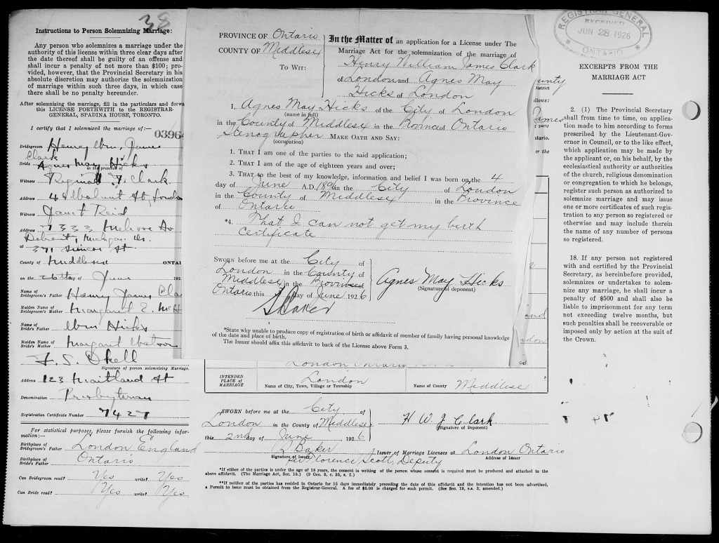 Family Search: Private Harry William James Clark was born on 24 July 1893, in London, Ontario, Canada. He had at least 2 daughters with Agnes May Hicks. He registered for military service in 1914. In 1915, at the age of 22, his occupation is listed as fitter. He died in 1967, in London, Ontario, Canada, at the age of 74, and was buried in Mount Pleasant Cemetery, West McGillivray, Middlesex, Ontario, Canada.