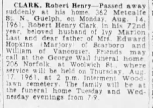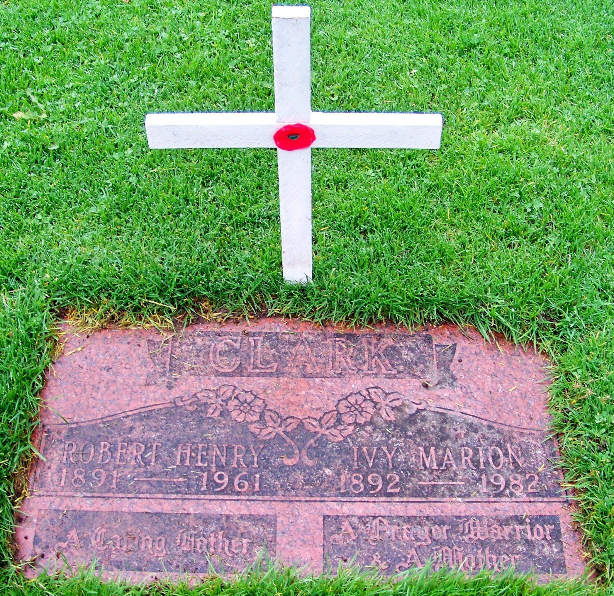 Family Search: When Private Robert Henry Clark was born on 4 May 1890, in Great Clacton, Essex, England, his father, Alfred Clark, was 31 and his mother, Emma Elizabeth Williamson, was 31. He had at least 2 sons and 1 daughter with Ivy Marion Last. He lived in Great Clacton, Essex, England, United Kingdom, in 1911. He registered for military service in 1914. In 1931, at the age of 41, his occupation was listed as a guard. He died on 14 August 1961, in Guelph, Wellington, Ontario, Canada, at the age of 71, and was buried in West Vancouver, Metro Vancouver, British Columbia, Canada