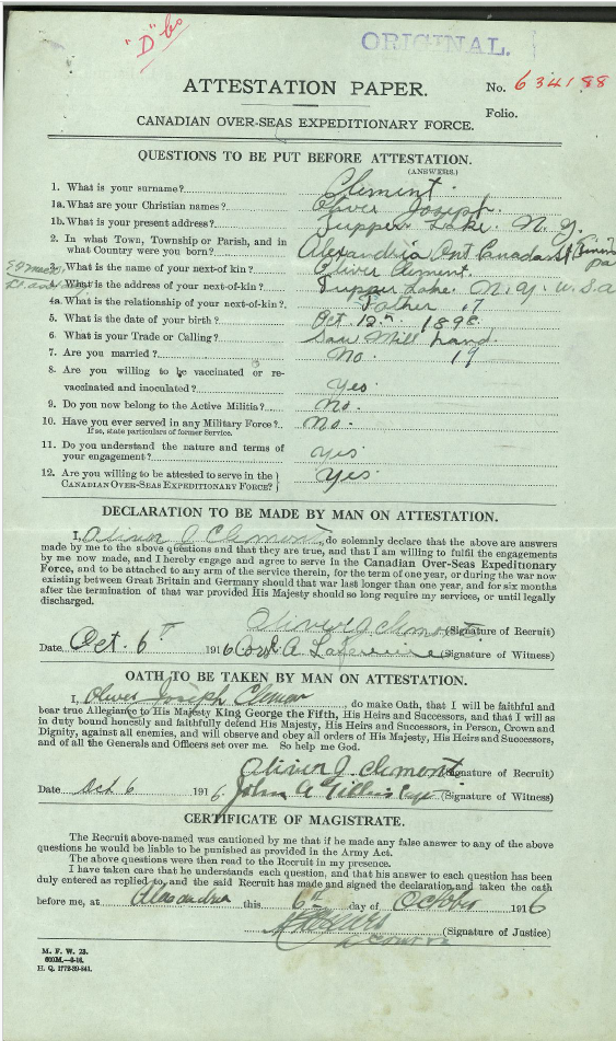 Family Search: When Private Oliver Joseph Clement was born on 12 October 1898, in Alexandria, Lochiel, Stormont Dundas and Glengarry, Ontario, Canada, his father, Olivier Clément, was 20 and his mother, Marie Rose Sabourin, was 20. He married Bertha M Pickering on 16 August 1919, in Tupper Lake, Altamont, Franklin, New York, United States. He lived in Tupper Lake, Altamont, Franklin, New York, United States in 1916 and Tupper Lake, Franklin, New York, United States for about 10 years. He registered for military service in 1916. In 1916, at the age of 18, his occupation is listed as sawmill hand in Tupper Lake, Altamont, Franklin, New York, United States. He died on 30 April 1960, in Ilion, German Flatts, Herkimer, New York, United States, at the age of 61.