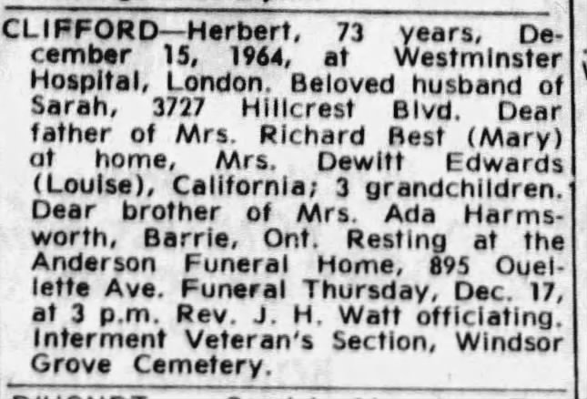Family Search: When Private Herbert Clifford was born on 27 September 1892, in Grays, Essex, England, United Kingdom, his father, Joseph Clifford, was 35 and his mother, Mary Ann Skingsley, was 33. He married Ethel May Grice on 15 July 1920, in Elgin, Ontario, Canada. He immigrated to Quebec City, Quebec, Canada in 1904 and lived in Windsor, Sandwich, Essex, Ontario, Canada in 1931 and Windsor, Essex, Ontario, Canada in 1964. He registered for military service in 1914. In 1931, at the age of 39, his occupation is listed as cane maker in Windsor, Essex, Ontario, Canada. He died on 15 December 1964, in London, Ontario, Canada, at the age of 72, and was buried in Windsor Grove Cemetery, Windsor, Essex, Ontario, Canada.