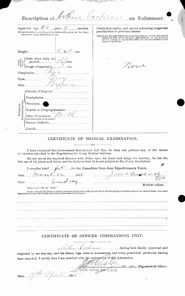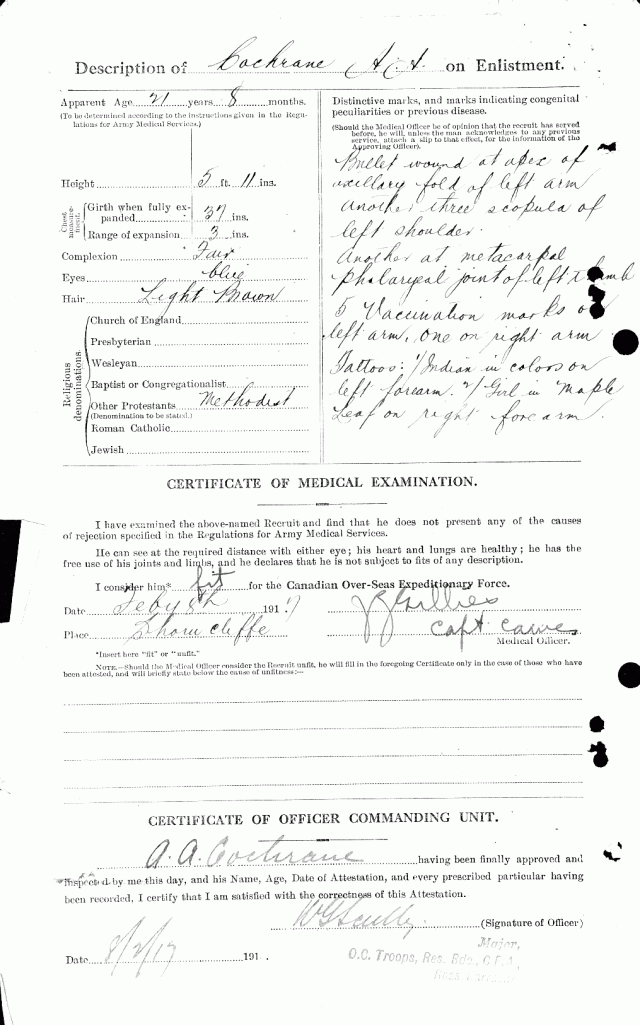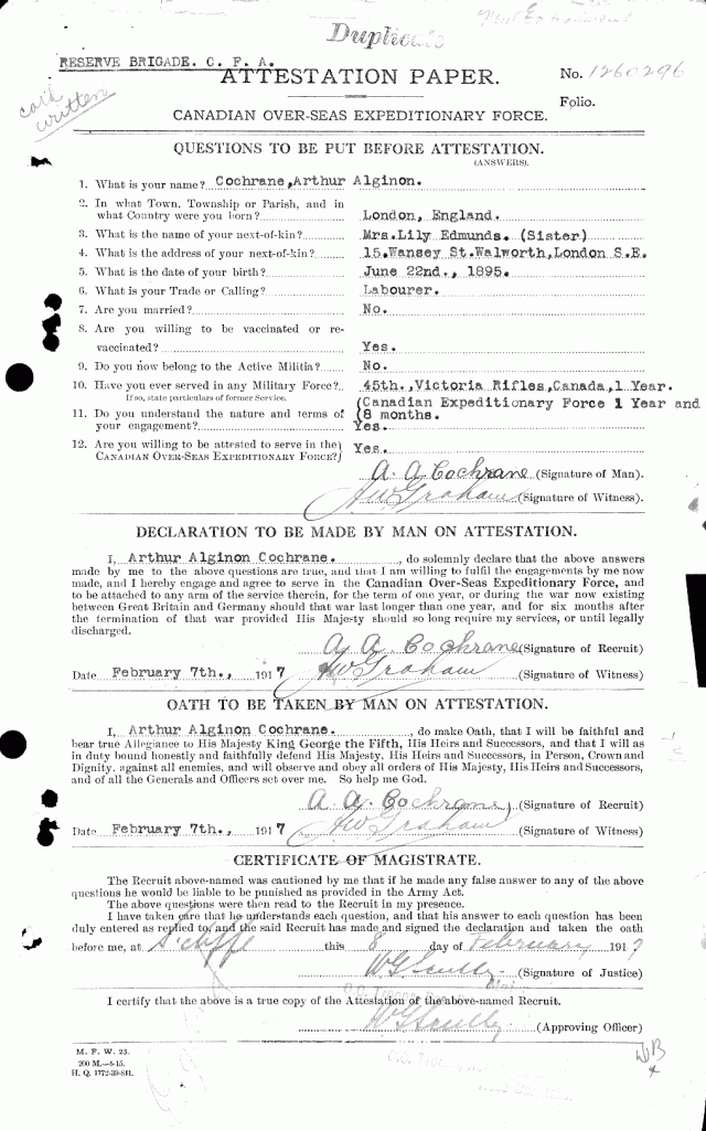 Family Search: Private Arthur Alginon William Cochrane was born on 22 June 1895, in Edmonton, London, England, United Kingdom as the son of Arthur Cochrane and Mary Ann Wells. He had at least 1 son with Olive Mary Workman. He lived in Toronto, York, Ontario, Canada for about 2 years and Scarborough, Toronto, Ontario, Canada in 1931. He registered for military service in 1915. In 1931, at the age of 36, his occupation is listed as chauffeur in Scarborough, York, Ontario, Canada. He died on 14 September 1972, in Toronto, Ontario, Canada, at the age of 77, and was buried in Pine Hills Cemetery, Toronto, Ontario, Canada