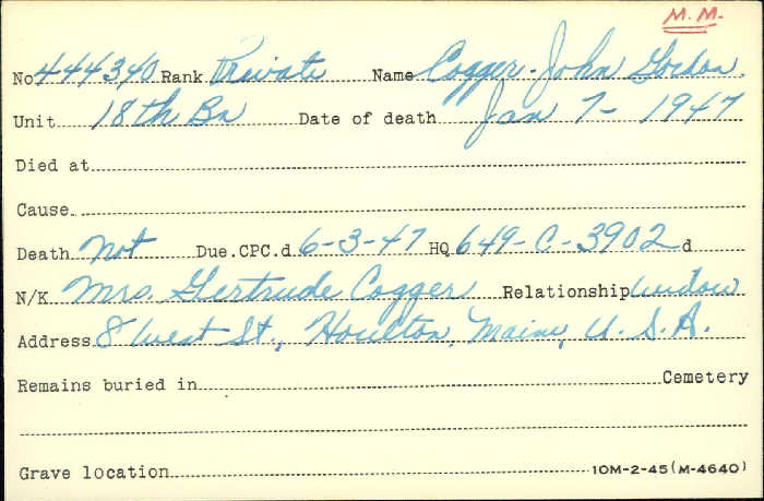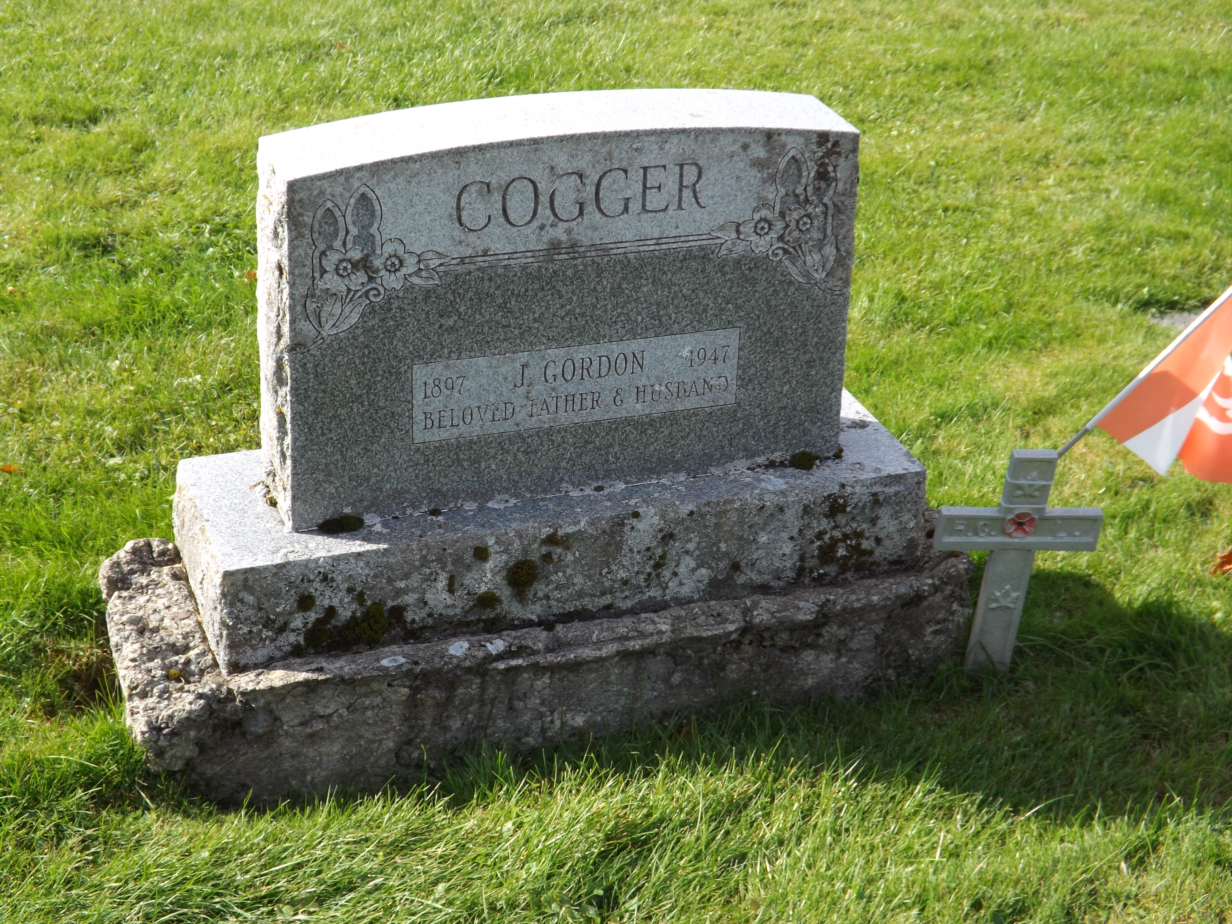 Family Search: When Sapper John Gordon Cogger was born on 16 April 1897, in Woodstock, Carleton, New Brunswick, Canada, his father, John E Cogger Jr, was 27 and his mother, Alice G Donnelly, was 26. He married Mary Gertrude Levasseur on 25 November 1920, in Fort Fairfield, Aroostook, Maine, United States. They were the parents of at least 4 sons. He immigrated to Houlton, Aroostook, Maine, United States in 1920 and lived in Presque Isle, Aroostook, Maine, United States for about 10 years and Houlton, Aroostook, Maine, United States in 1947. He registered for military service in 1915. In 1921, his occupation is listed as telegraph operator, bangor and aroostook railroad in Maine, United States. He died on 7 January 1947, in Lancaster, St. John, New Brunswick, Canada, at the age of 49, and was buried in Saint Marys Cemetery, Houlton, Aroostook, Maine, United States.