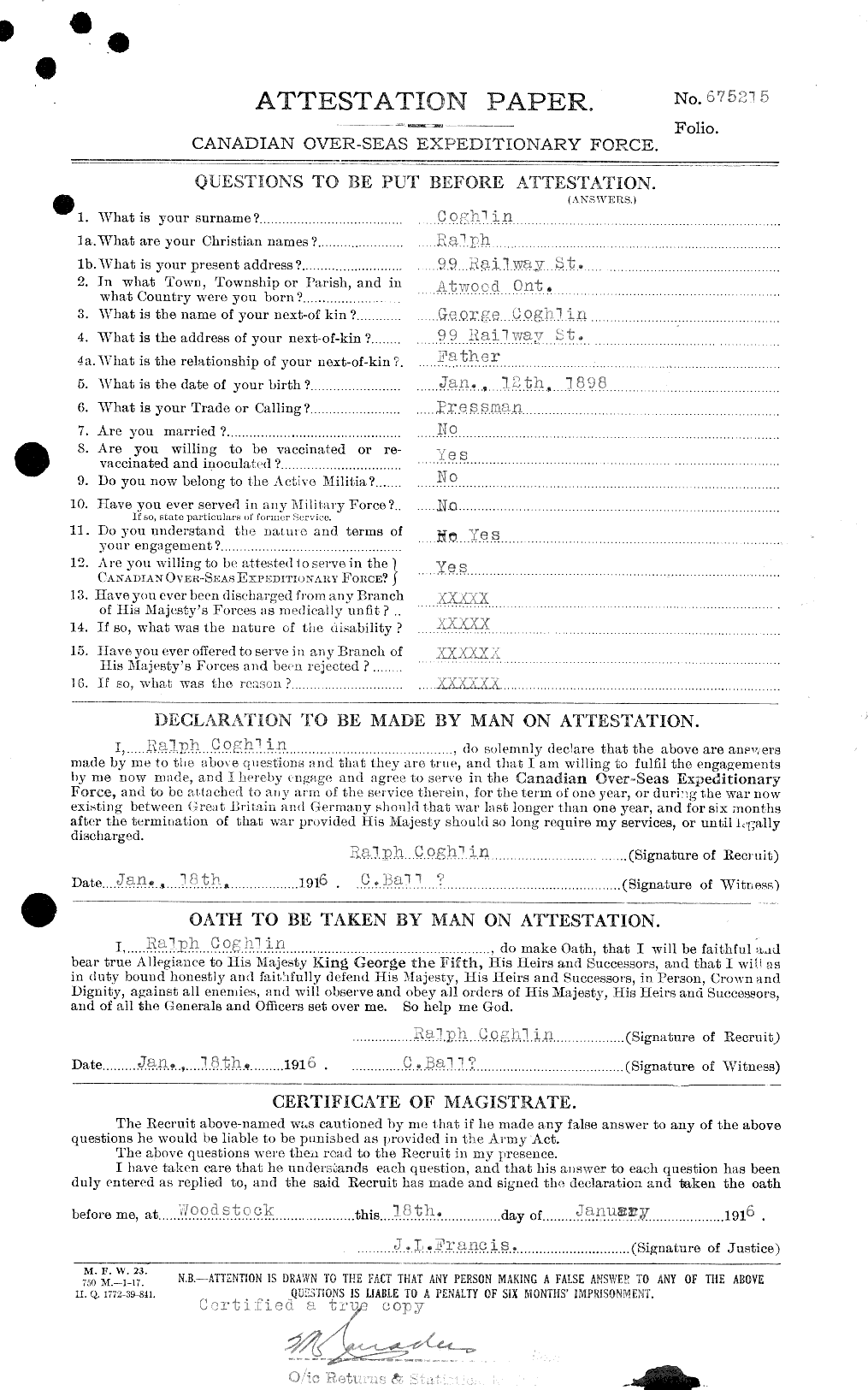 Joined underage. Actual date of birth was April 30, 1900. See documents below. Ralph Bryson Coghlin buried at Rosedale Cemetery, Moose Jaw, Saskatchewan.