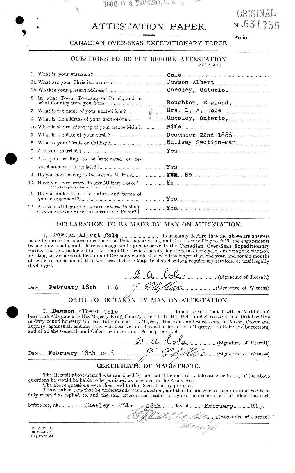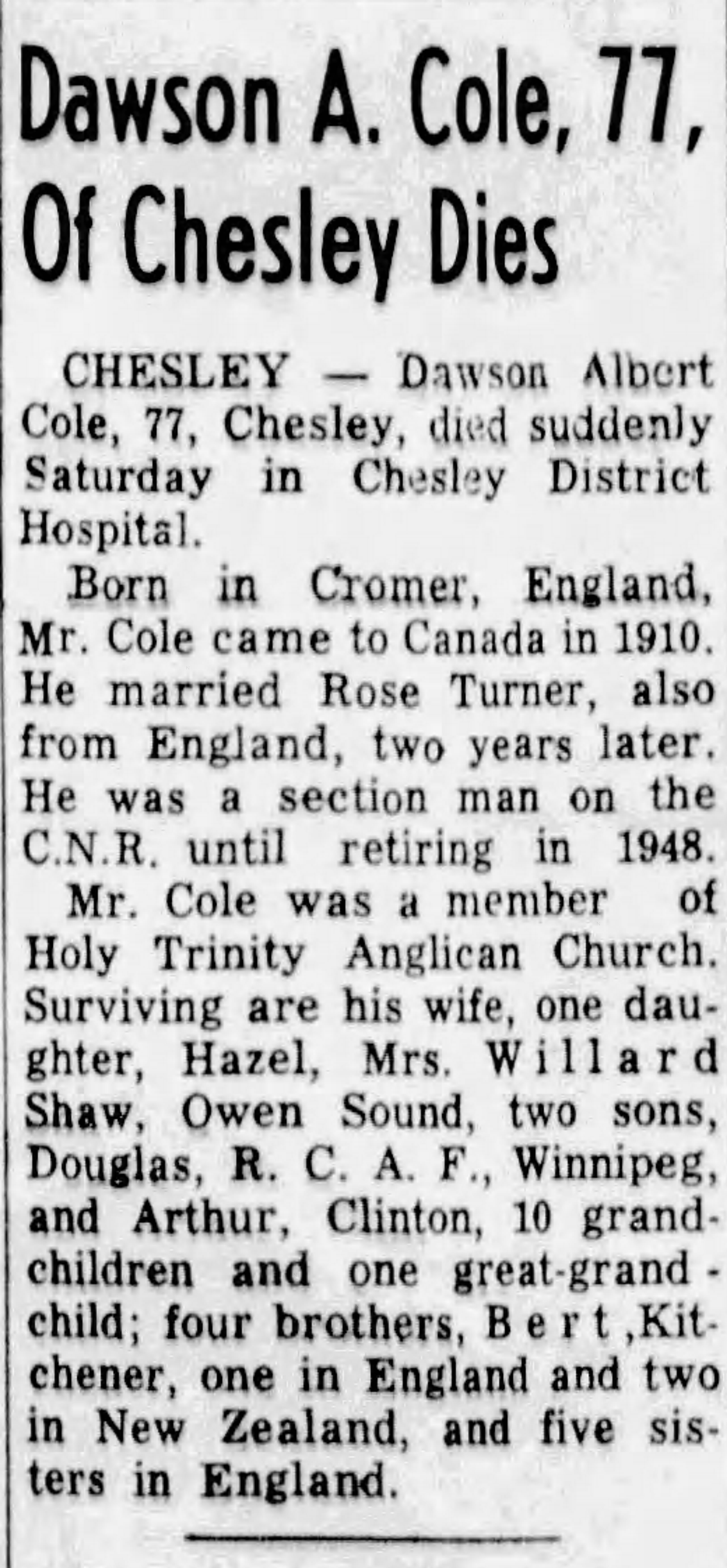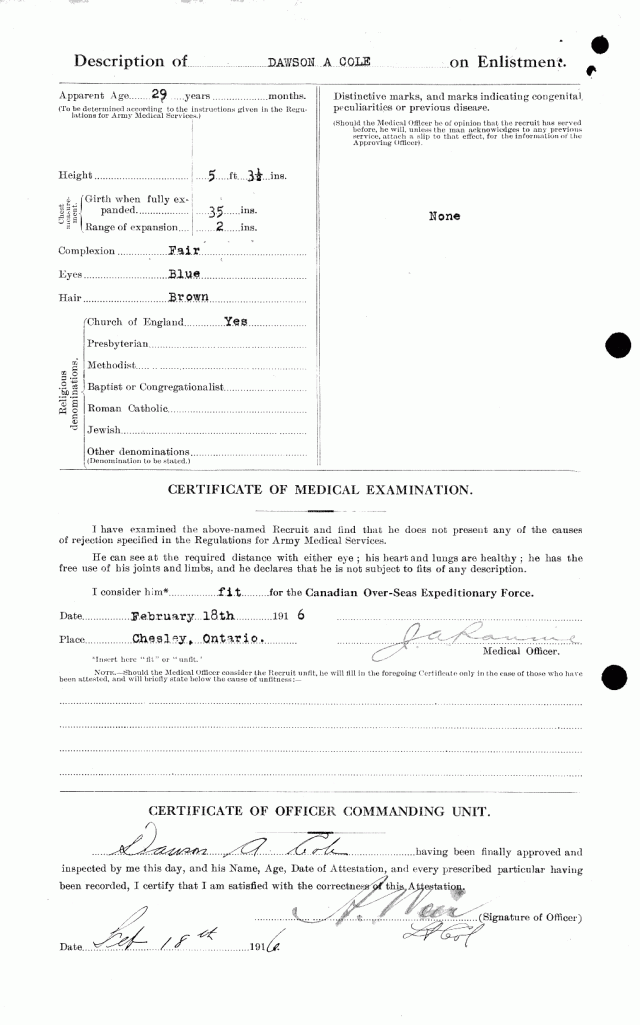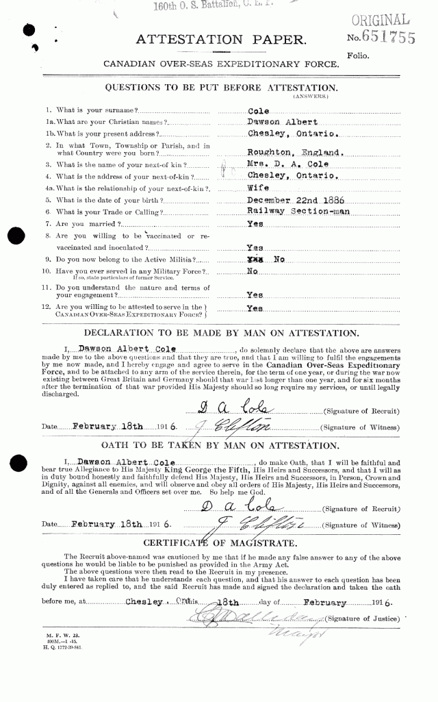 Family Search: When Private Dawson Albert Cole was born on 22 December 1886, in Roughton, Norfolk, England, United Kingdom, his father, William Cole, was 28 and his mother, Elizabeth Payne, was 25. He had at least 2 sons and 1 daughter with Rose Turner. He immigrated to Canada in 1910. He registered for military service in 1916. In 1916, at the age of 30, his occupation is listed as railway section man in Chesley, Bruce, Ontario, Canada. He died on 17 October 1964, in Chesley, Bruce, Ontario, Canada, at the age of 77, and was buried in Chesley Cemetery, Chesley, Bruce, Ontario, Canada.
