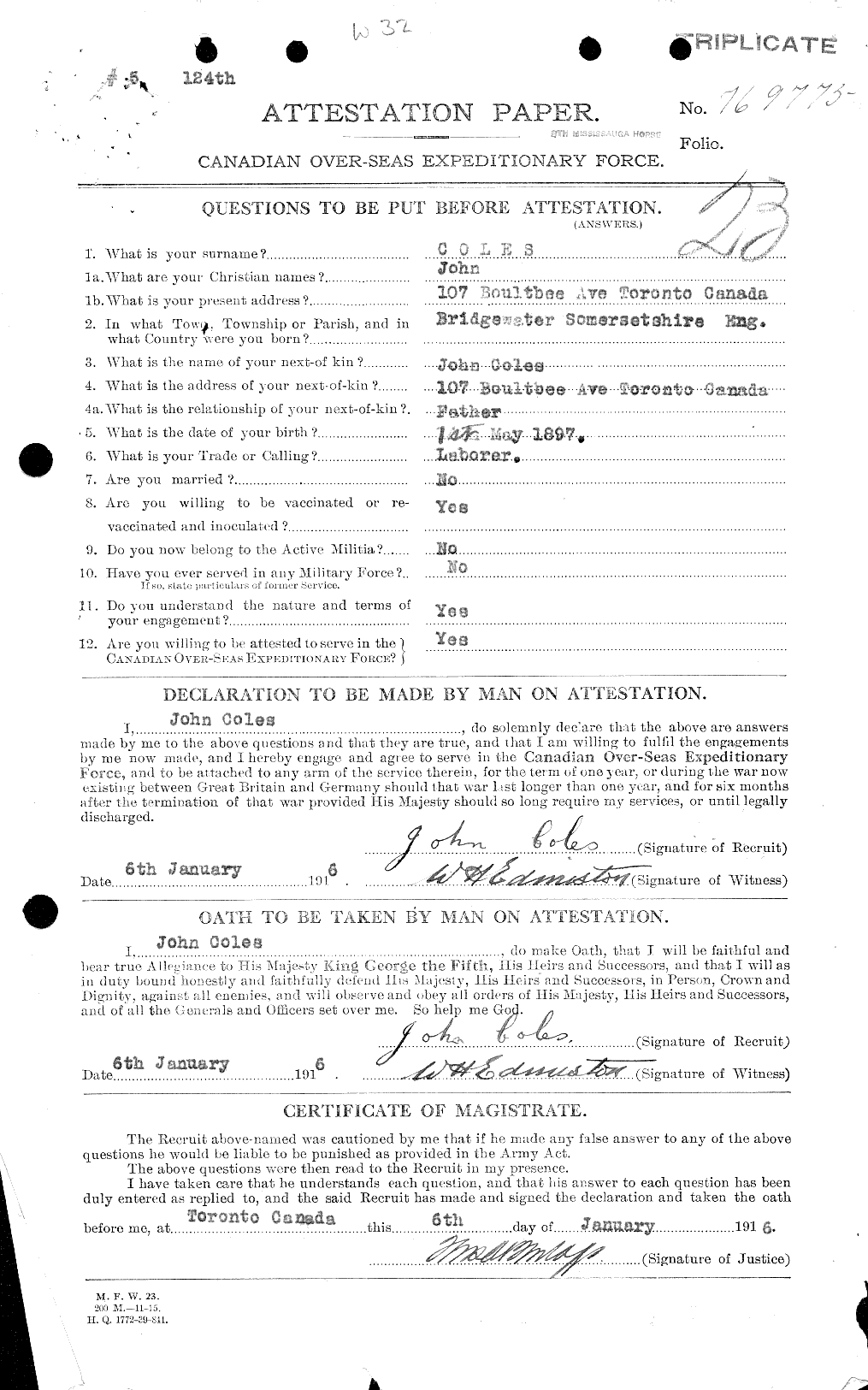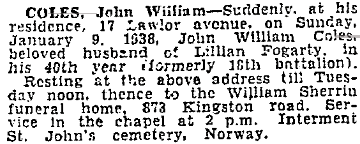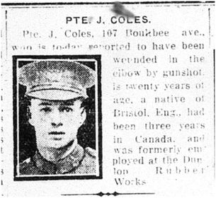 Coles, John: Service no. 769775 Digitized Service Record Source: Per news clipping post by David Archer at 18th Battalion Facebook Page (not group). Find-A-Grave Coles, John: Service no. 769775. Source: Toronto Telegram. April 1917. Per news clipping post by David Archer at 18th Battalion Facebook Page (not group). Share this: Click to email a link to a friend (Opens in new window) Email Click to share on Facebook (Opens in new window) Facebook Click to share on X (Opens in new window) X Click to share on Reddit (Opens in new window) Reddit Click to share on LinkedIn (Opens in new window) LinkedIn Click to print (Opens in new window) Print Click to share on Tumblr (Opens in new window) Tumblr Click to share on Pocket (Opens in new window) Pocket Click to share on Pinterest (Opens in new window) Pinterest Click to share on Telegram (Opens in new window) Telegram Click to share on WhatsApp (Opens in new window) WhatsApp Like Loading...