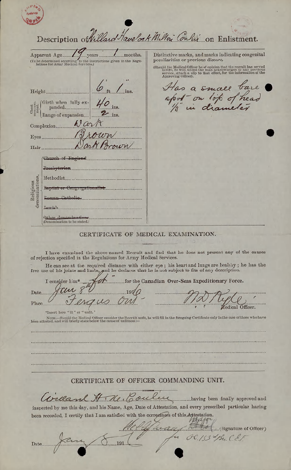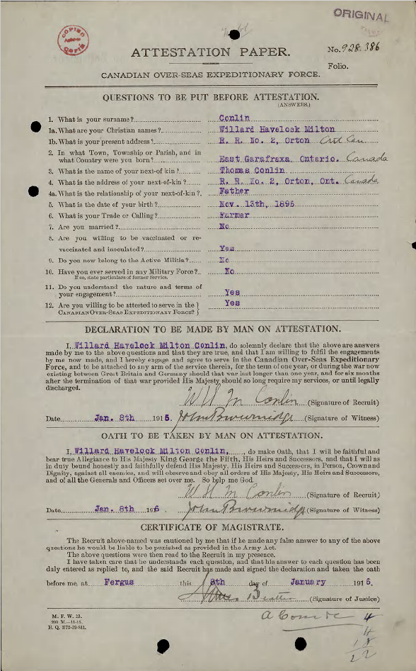 Family Search: When Private Willard Havelock Milton Conlin was born on 13 November 1896, in East Garafraxa Township, Dufferin, Ontario, Canada, his father, Thomas Conlin, was 43 and his mother, Elizabeth Ross, was 33. He married Florence Luella Johnston on 22 September 1923, in Ontario, Ontario, Canada. They were the parents of at least 2 sons and 1 daughter. He lived in Ontario, Canada in 1896 and Wellington, Ontario, Canada in 1901. He died in 1982, at the age of 86, and was buried in Fergus, Centre Wellington, Wellington, Ontario, Canada.