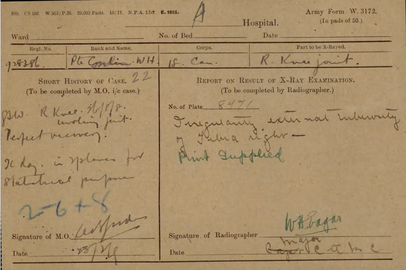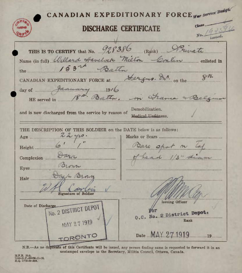 153rd Wellington: Trade listed as Farmer. DOB 13-11-96, born West Garafraxa. 6 foot 1 inch. Brown eyes, dark brown hair. Methodist. NOK Thomas Conlin, father. Elizabeth Conlin, mother. Brother to 928189 Harry Ross Conlin. Enlisted Fergus 18-1-16 (age 19 years 1 month). On 153rd Battalion Nominal Roll as published Guelph Mercury 1-12-16. Embarked with the 153rd Halifax N.S. SS Olympic 29-4-17. Arrived Liverpool 7-5-17. Assigned 25th Reserve for Training and Administration. Taken on Strength 18th Battalion 18-12-17. Hospitalized 10-1-18, German Measles. Returned to Canadian Reinforcements 27-2-18. Taken on Strength 18th Battalion in the field 8-8-18. Wounded 28-8-18, GSW right knee and tibia. Globe & Mail Casualty List 8-9-18 under Infantry reports wounded. Returned to Canada SS Aquitania 25-5-19. Demobilized Toronto 27-5-19. Died 1982 buried Belsyde Cemetery Fergus, headstone photo courtesy B. Gilbert. Photo ph15588 courtesy Wellington County Museum & Archives.