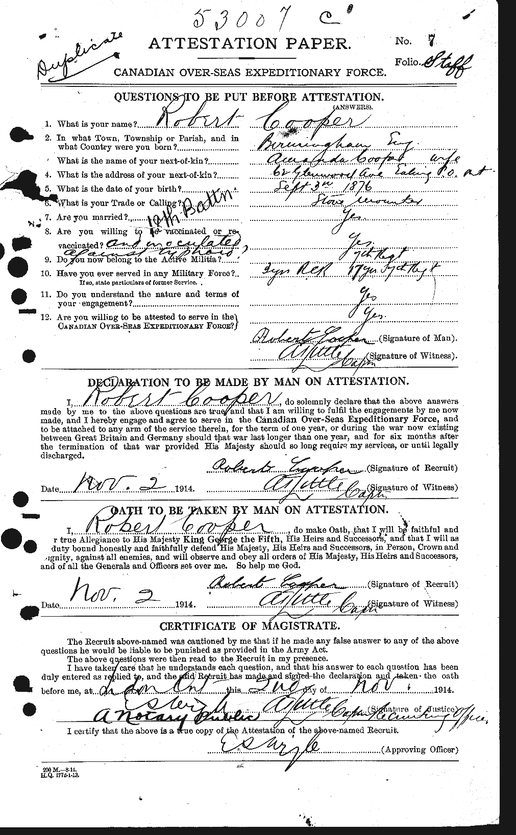 Source: Looking for a Robert Cooper but there is another one that is referred to in the Toronto World March 31 1916 Casualties list.