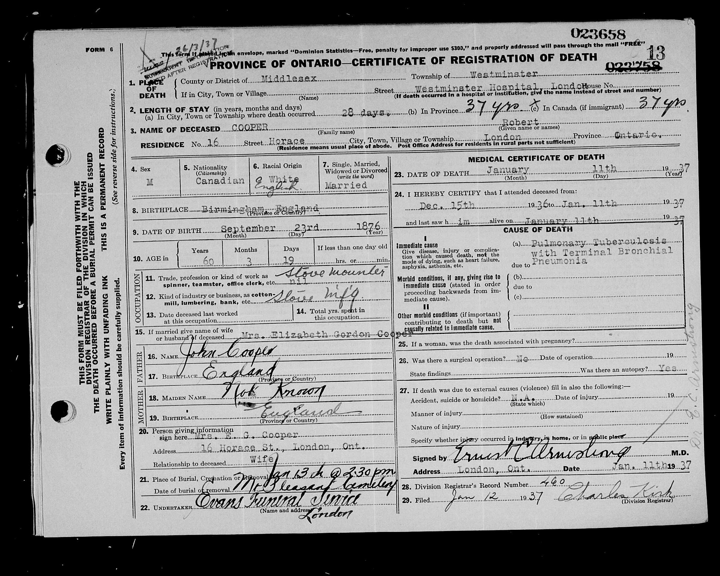 Sergeant Cooper dies on 11 January 1937 due to pulmonary tuberculosis with terminal bronchial pneumonia. He died at Westminster Hospital and was admitted on 15 December 1936. His wife was Mrs. Elizabeth (Gordon) Cooper living at 16 Horace Street, London, Ontario.