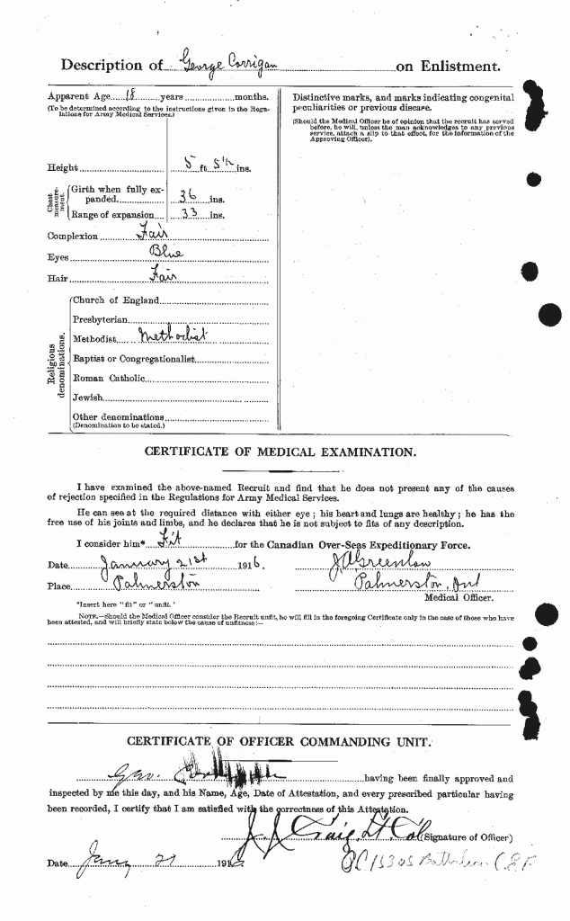 “Trade listed as Gentleman. DOB 19-7-98, born Palmerston 5 foot 5 1/2 inches. Blue eyes, fair hair. Methodist. NOK Robert Corrigan, father. Mary Jane McDonald, mother. Enlisted Palmerston 21-1-16 (age 18 years). On 153rd Nominal Roll 29-1-16, no transfer noted. On 153rd Nominal Roll as published Guelph Mercury 10-1-16. On 153rd Battalion Nominal Roll as published Guelph Mercury 1-12-16. Embarked with 153rd Halifax N.S. SS Olympic 29-4-17. Arrived Liverpool 7-5-17. Assigned 25th Reserve for Training and Administration. Taken on Strength 18th Battalion 19-2-18. Returned to Canada aboard SS Caronia, Halifax N.S. 22-5-19. Demobilized London 24-5-19.