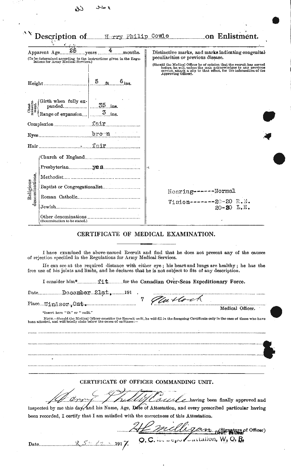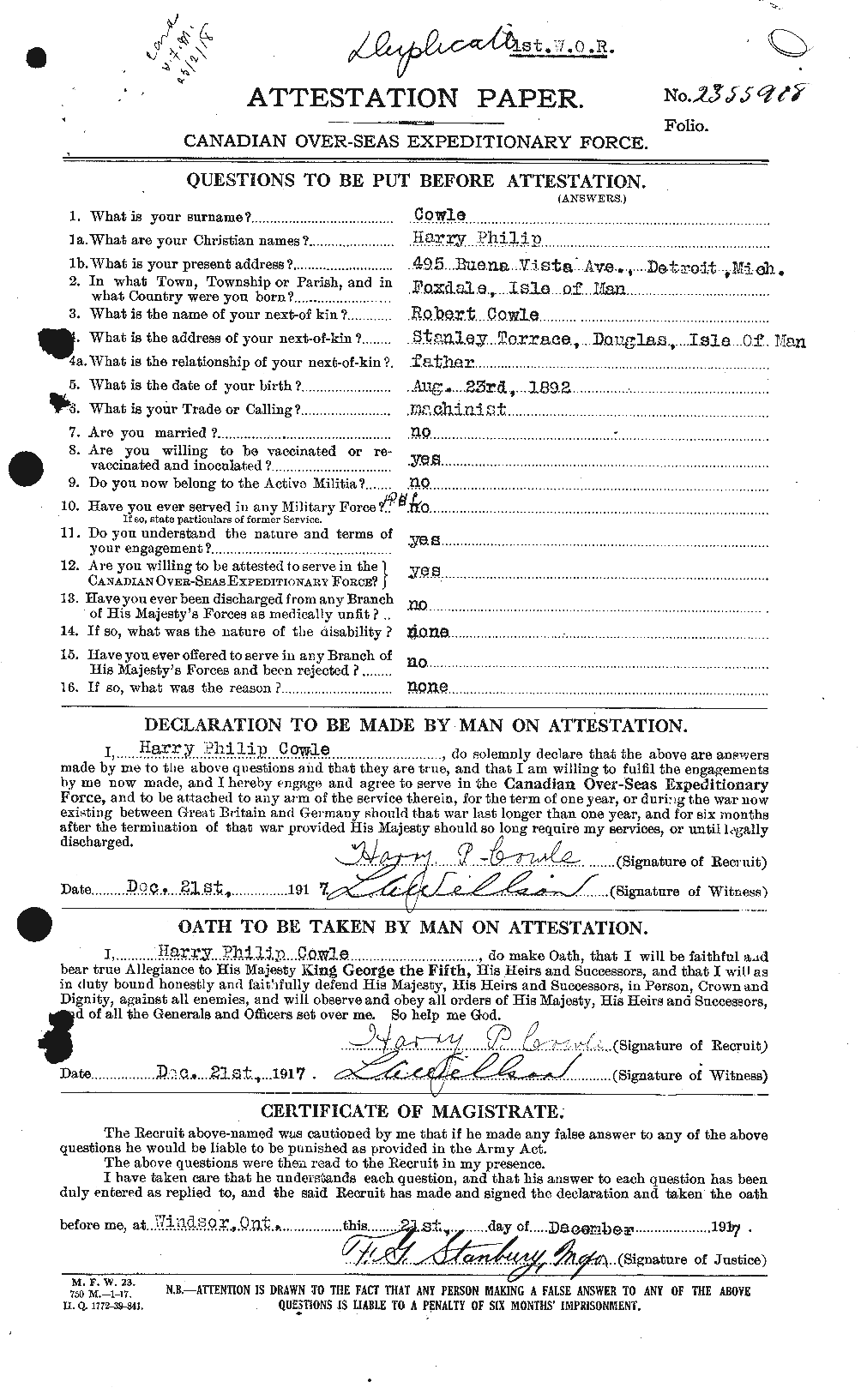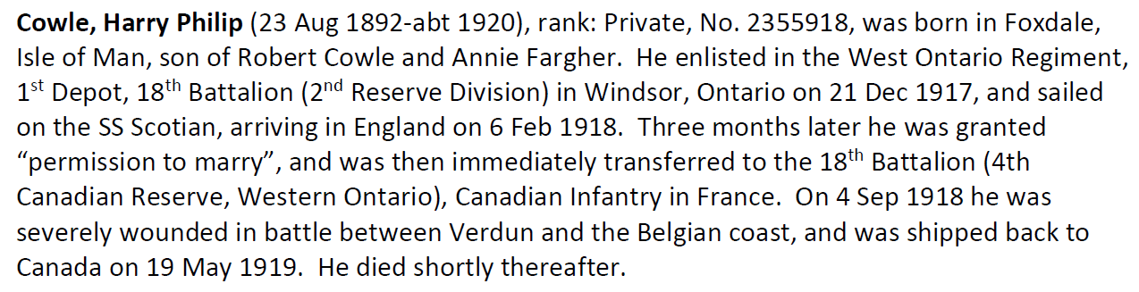 Family Search: When Private Philip Henry Cowle was born on 23 August 1892, in Foxdale, Isle of Man, his father, Robert Cowle, was 40 and his mother, Annie Fargher, was 43. He immigrated to Halifax, Nova Scotia, Canada in 1919 and lived in Detroit, Wayne, Michigan, United States in 1917 and Chicago, Cook, Illinois, United States in 1922. He registered for military service in 1917. In 1917, at the age of 25, his occupation is listed as machinist in Detroit, Wayne, Michigan, United States.