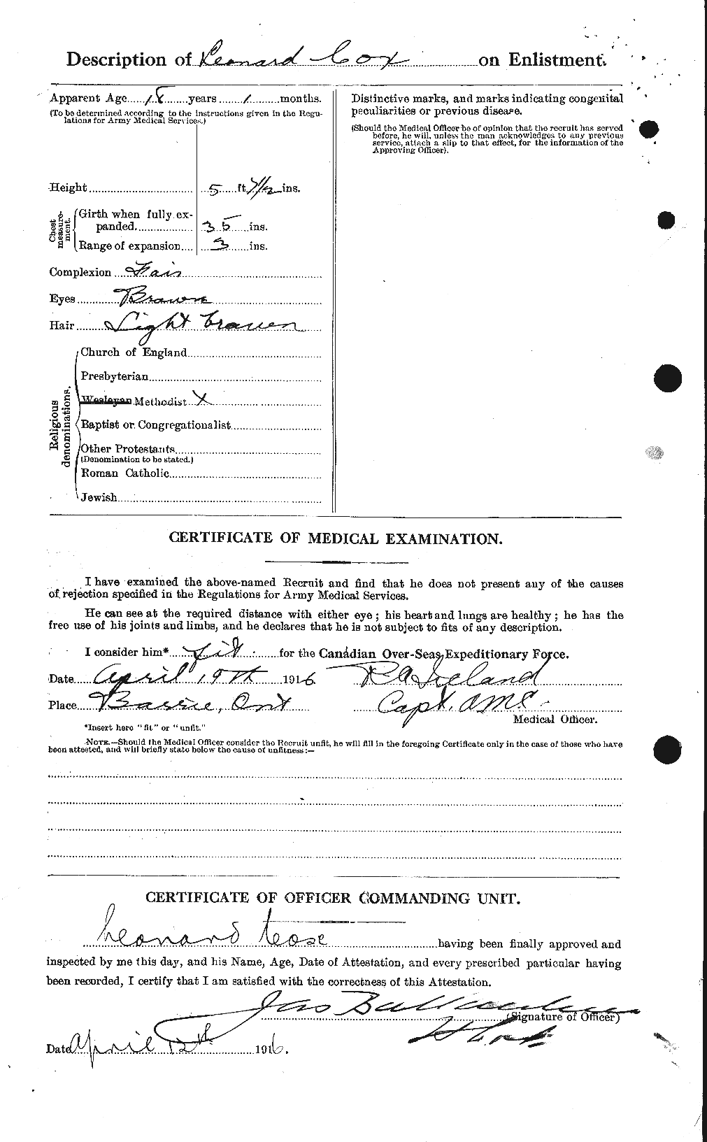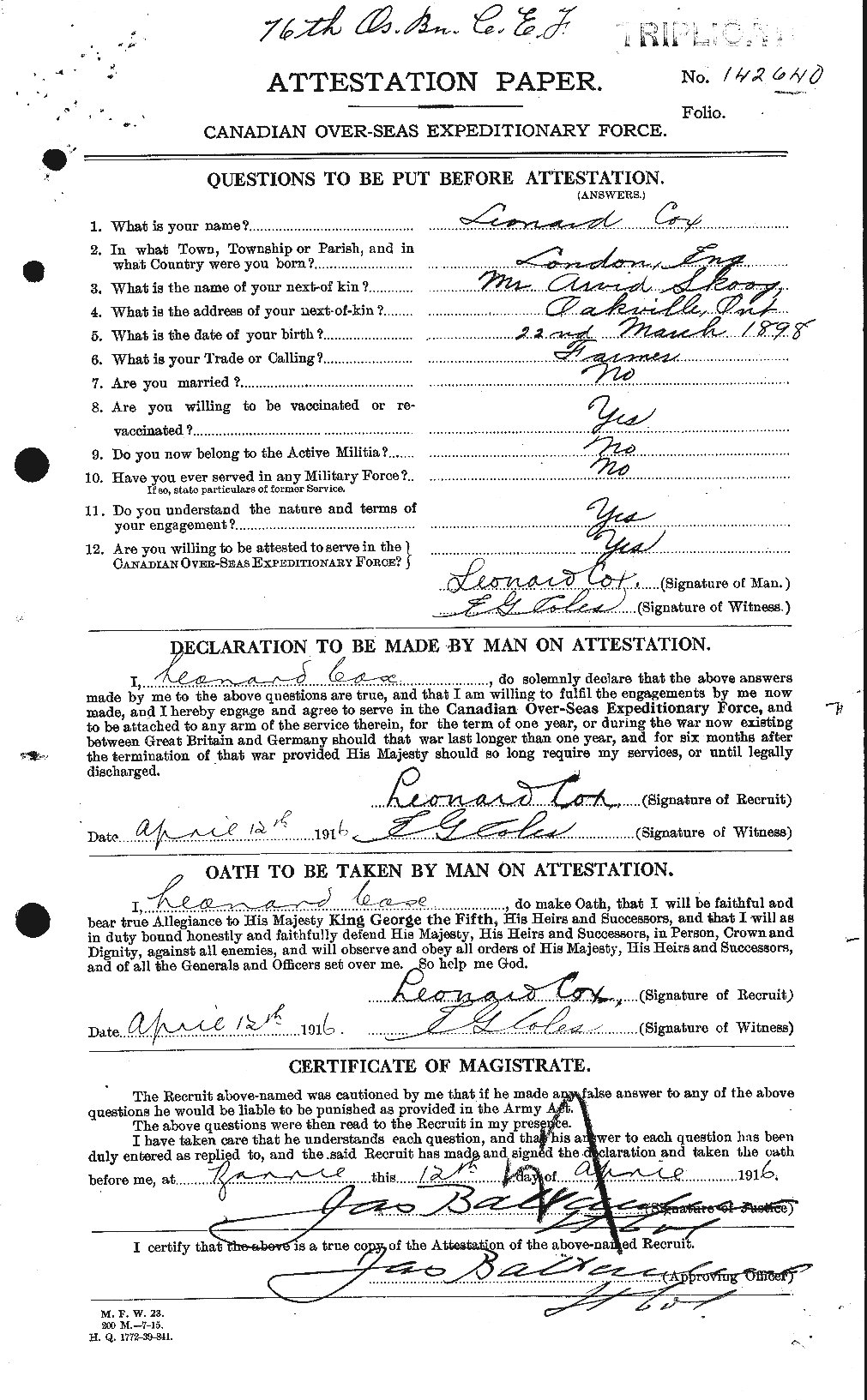 Leonard Cox (b. 22 March 1898) enlisted under the reg. no. of 142640 and put as his next-of-kin at a Mr. Avid Skoog. He indicated he was born at London, England and was a farmer.