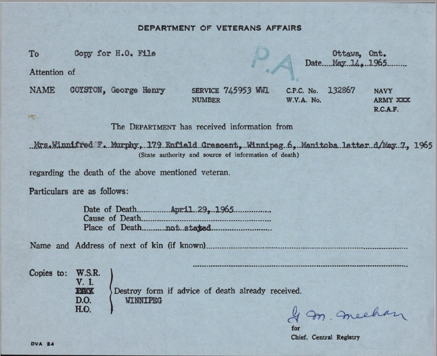 Family Search: When George Henry Coyston was born on 16 June 1892, in Mile End, London, England, United Kingdom, his father, Arthur Coyston, was 32 and his mother, Hannah Clara Wales, was 29. He married Florence Bridget Gange on 8 May 1916, in Oshawa, Ontario, Canada West, British Colonial America. They were the parents of at least 2 sons and 3 daughters. He lived in Oshawa, Durham, Ontario, Canada in 1915 and St. Vital, Winnipeg, Manitoba, Canada in 1922. He registered for military service in 1915. In 1915, at the age of 23, his occupation is listed as shipper. He died on 29 April 1965, in Winnipeg, Manitoba, Canada, at the age of 72, and was buried in Saint Marys Cemetery, Winnipeg, Winnipeg, Manitoba, Canada.