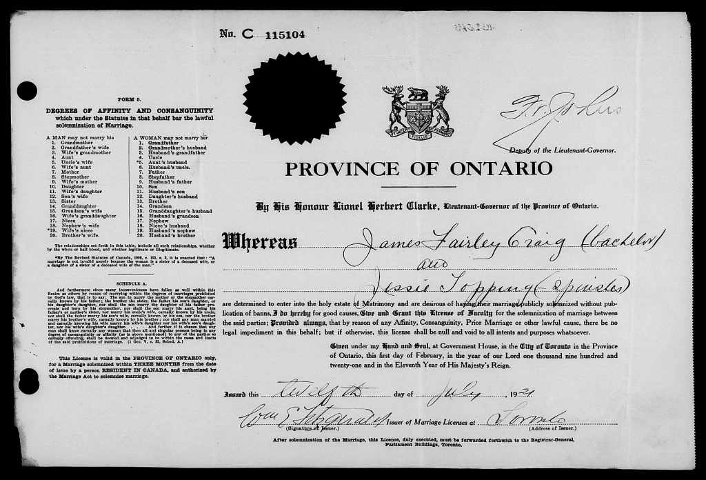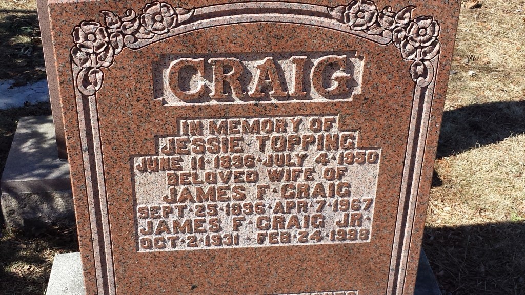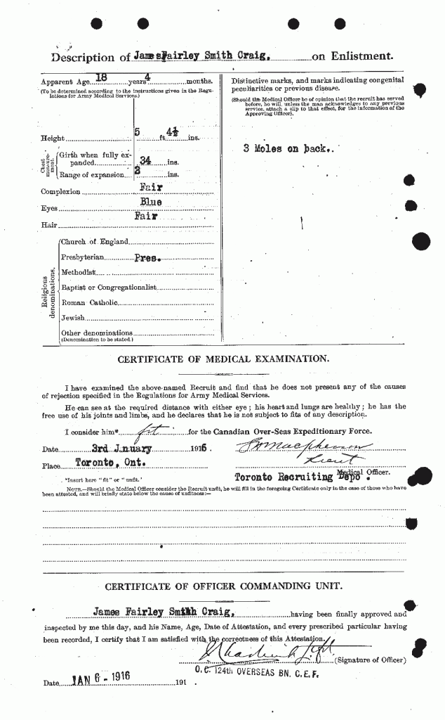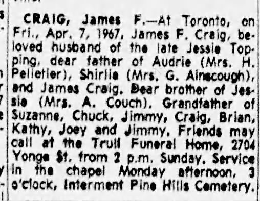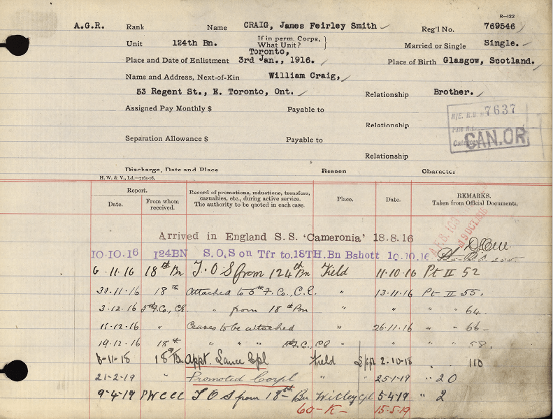Family Search: When Corporal James Fairley Smith Craig was born on 25 September 1897, in Glasgow, Lanarkshire, Scotland, his father, James Craig, was 36 and his mother, Lizzie F, was 35. He married Jessie Topping on 12 July 1921, in Toronto, Ontario, Canada. They were the parents of at least 2 sons and 4 daughters. He immigrated to Halifax, Nova Scotia, Canada in 1919 and lived in Toronto, York, Ontario, Canada for about 7 years and Scarborough, Toronto, Ontario, Canada in 1931. He registered for military service in 1916. In 1916, at the age of 19, his occupation is listed as shipping clerk in Toronto, York, Ontario, Canada. He died on 7 April 1967, in Toronto, Ontario, Canada, at the age of 69, and was buried in Scarborough, Toronto, Ontario, Canada.