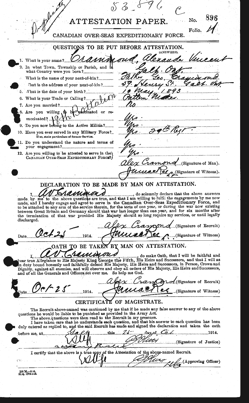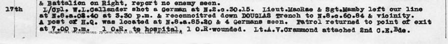 Source: Found during research regarding German trench raid on Battalion on July 18, 1918. Mentioned in War Diary on the 17th but the spelling of his name is incorrect (A.V. Crammond). Did search using LAC and found correct soldier.