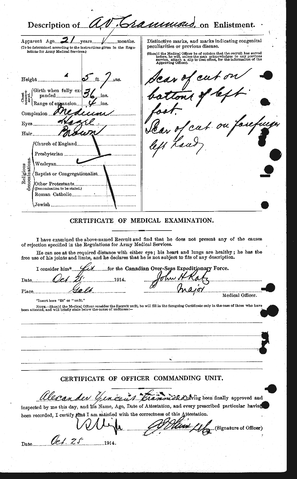 Family Search: When Lieutenant Alexander Vincent Cramond was born on 10 May 1893, in Galt, Waterloo, Ontario, Canada, his father, George Cramond, was 46 and his mother, Jane Stewart Farguhar, was 34. He married Agnes Louisa Spring on 7 June 1921, in Galt, Waterloo, Ontario, Canada. They were the parents of at least 1 daughter. He lived in Waterloo, Ontario, Canada for about 10 years. He registered for military service in 1914. In 1914, at the age of 21, his occupation is listed as pattern maker in Galt, Waterloo, Ontario, Canada. He died on 5 November 1957, in Canada, at the age of 64, and was buried in Mountview Cemetery, Galt, Waterloo, Ontario, Canada.