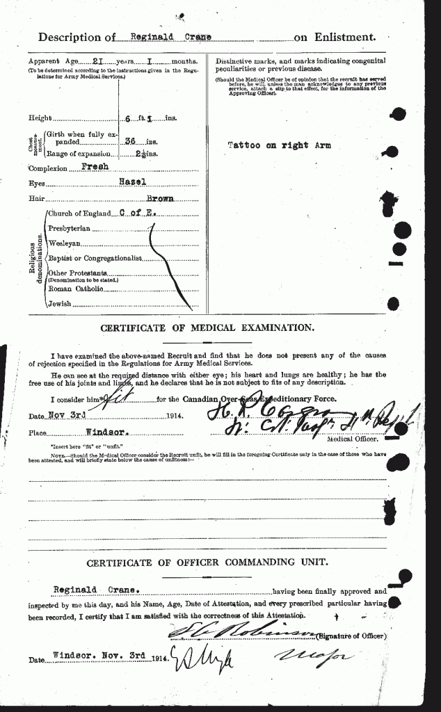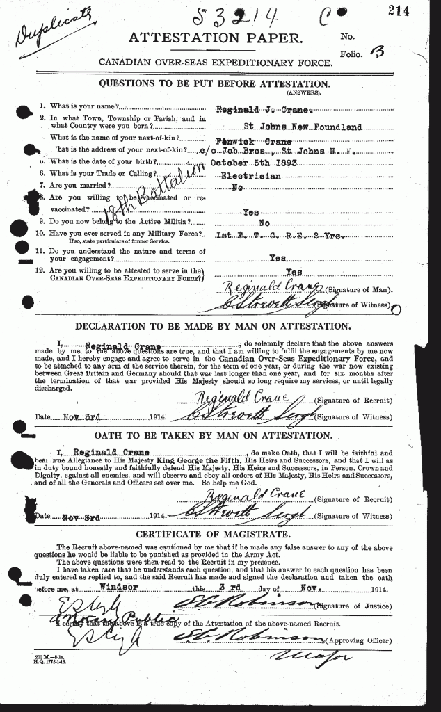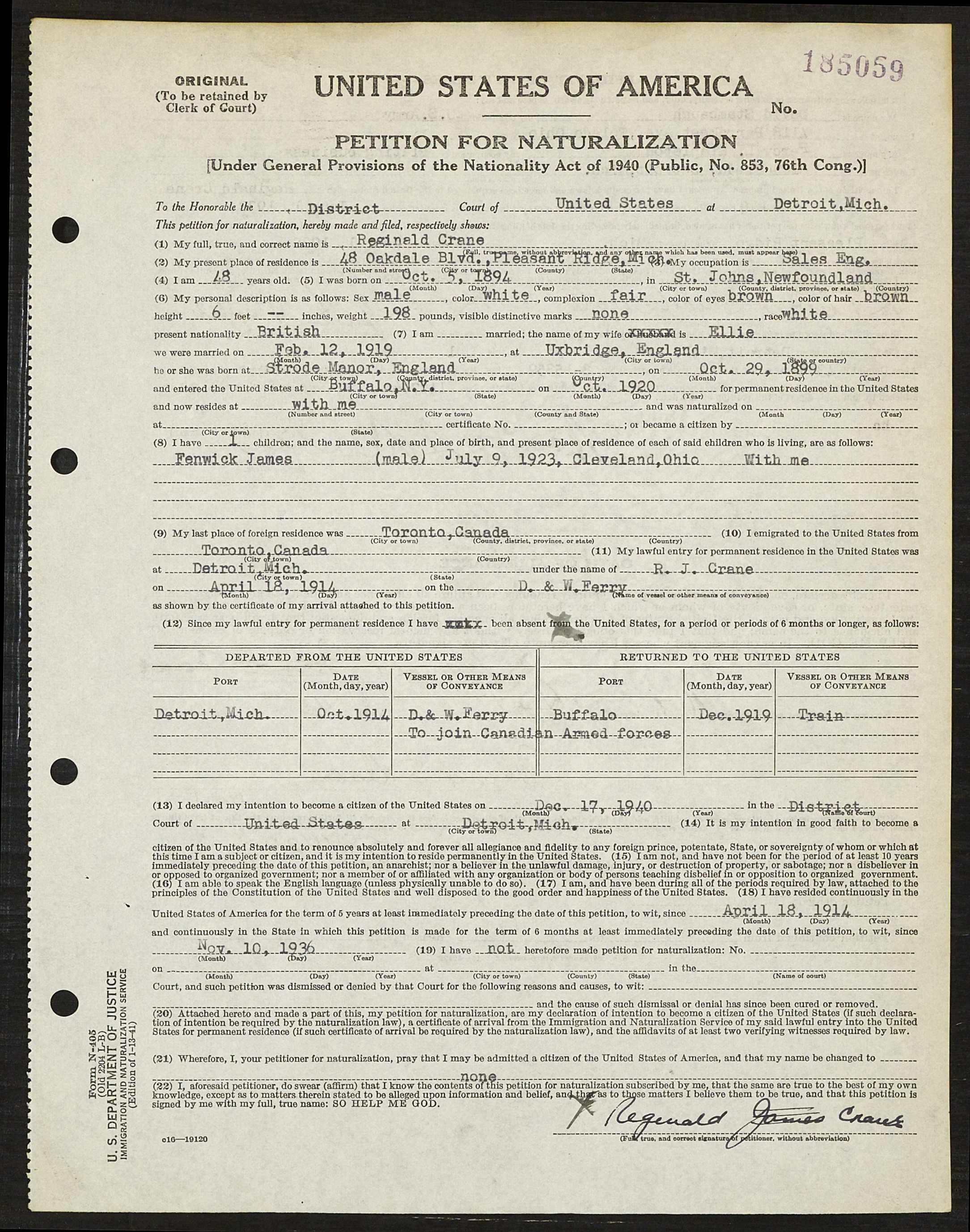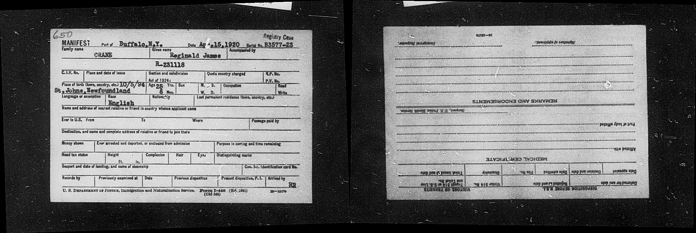 Family Search: When Reginald James Crane was born on 5 October 1895, in St. John’s, Newfoundland, his father, Fenwick Crane, was 31 and his mother, Mary Morry, was 33. He married Ellie Gladys Lloyds May Coombs on 12 September 1919, in Uxbridge, Middlesex, England, United Kingdom. They were the parents of at least 1 son. He immigrated to Detroit, Wayne, Michigan, United States in 1914 and lived in Toledo, Lucas, Ohio, United States in 1930 and Pleasant Ridge, Oakland, Michigan, United States in 1940. He registered for military service in 1914. In 1914, at the age of 19, his occupation is listed as electrician. He died on 25 November 1977, in West Palm Beach, Palm Beach, Florida, United States, at the age of 82, and was buried in Juno Beach, Palm Beach, Florida, United States.