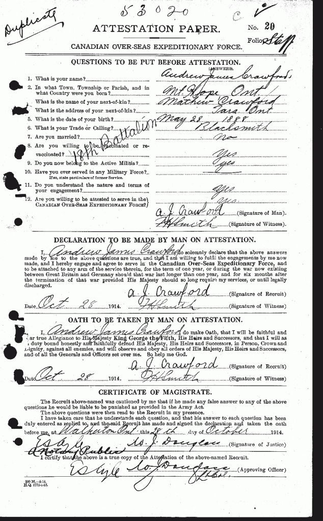 Crawford, Andrew James: Service no. 53020 Digitized Service Record Source: 18th Battalion Nominal Roll, April 1915. Find-A-Grave Share this: Click to email a link to a friend (Opens in new window) Email Click to share on Facebook (Opens in new window) Facebook Click to share on X (Opens in new window) X Click to share on Reddit (Opens in new window) Reddit Click to share on LinkedIn (Opens in new window) LinkedIn Click to print (Opens in new window) Print Click to share on Tumblr (Opens in new window) Tumblr Click to share on Pocket (Opens in new window) Pocket Click to share on Pinterest (Opens in new window) Pinterest Click to share on Telegram (Opens in new window) Telegram Click to share on WhatsApp (Opens in new window) WhatsApp Like Loading...
