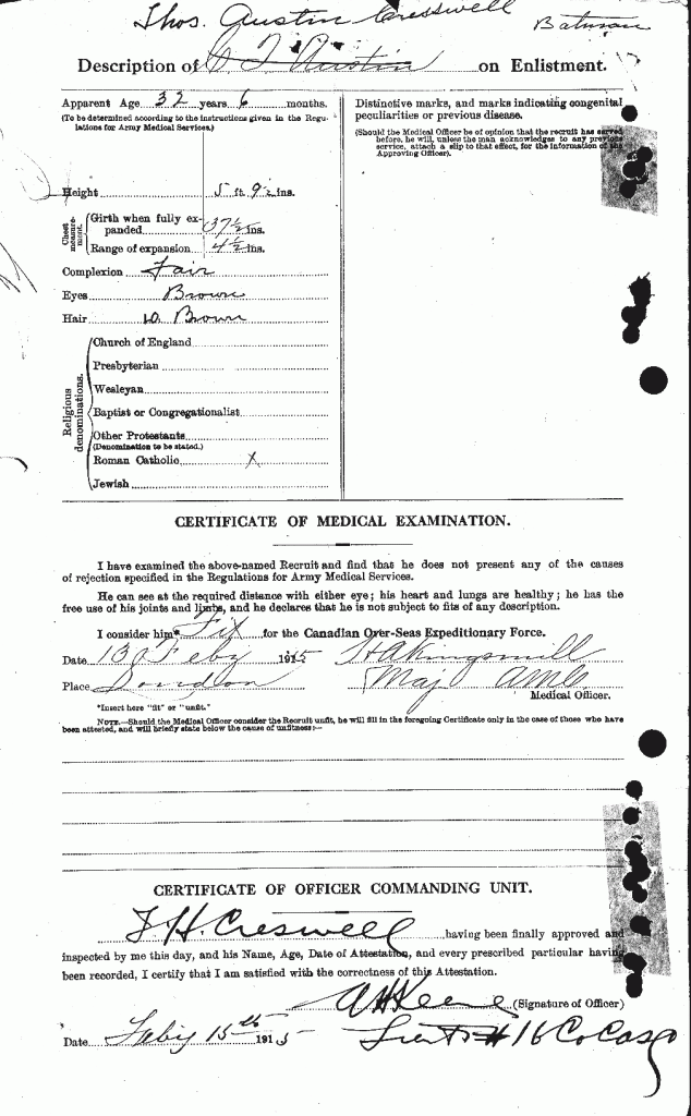 Family Search: SQMS Thomas Austin Cresswell was born on 23 October 1880, in Walton, West Yorkshire, England, United Kingdom as the son of James George Cresswell and Mary Gillingham. He immigrated to Canada in 1913 and lived in London, Ontario, Canada in 1919 and Victoria, Vancouver Island, British Columbia, Canada in 1921. He registered for military service in 1914. In 1915, at the age of 35, his occupation is listed as salesman. He died on 3 December 1959, in Saanich, British Columbia, Canada, at the age of 79, and was buried in Veterans Cemetery, Victoria, British Columbia, Canada.MORE