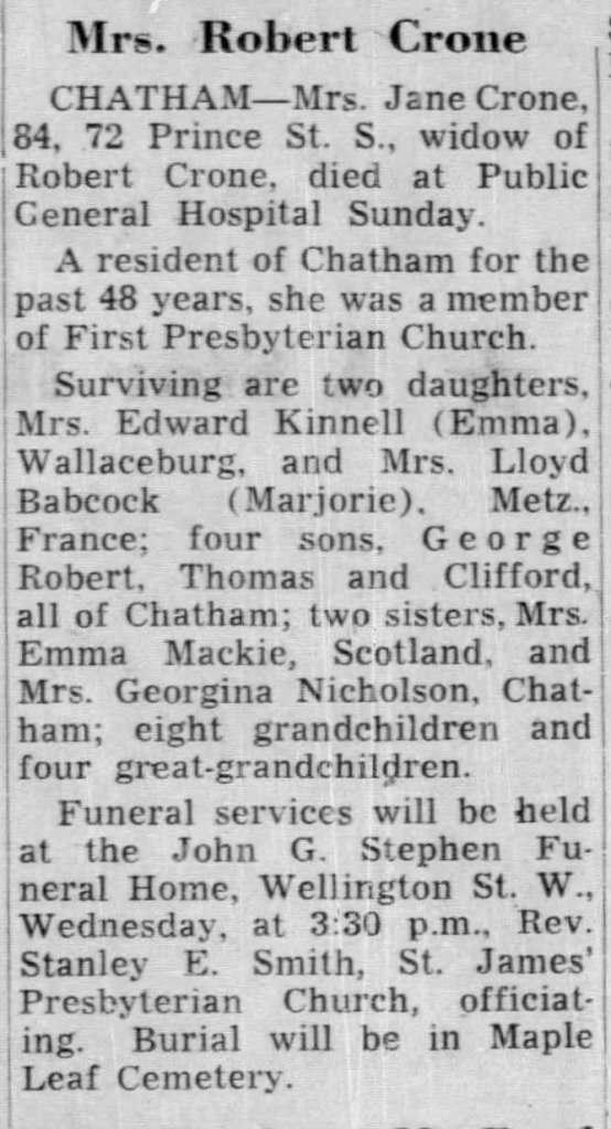 Family Search: When Private Robert Crone was born on 11 June 1883, in Annan, Dumfriesshire, Scotland, United Kingdom, his father, William Crone, was 38 and his mother, Robina Bell, was 38. He married Jane Byers in 1900, in Scotland, United Kingdom. They were the parents of at least 4 sons and 2 daughters. He immigrated to Canada in 1912. He registered for military service in 1916. In 1919, his occupation is listed as shipping clerk in Chatham, Kent, Ontario, Canada. He died on 25 March 1949, in Chatham, Kent, Ontario, Canada, at the age of 65, and was buried in Maple Leaf Cemetery, Chatham, Chatham-Kent, Ontario, Canada.
