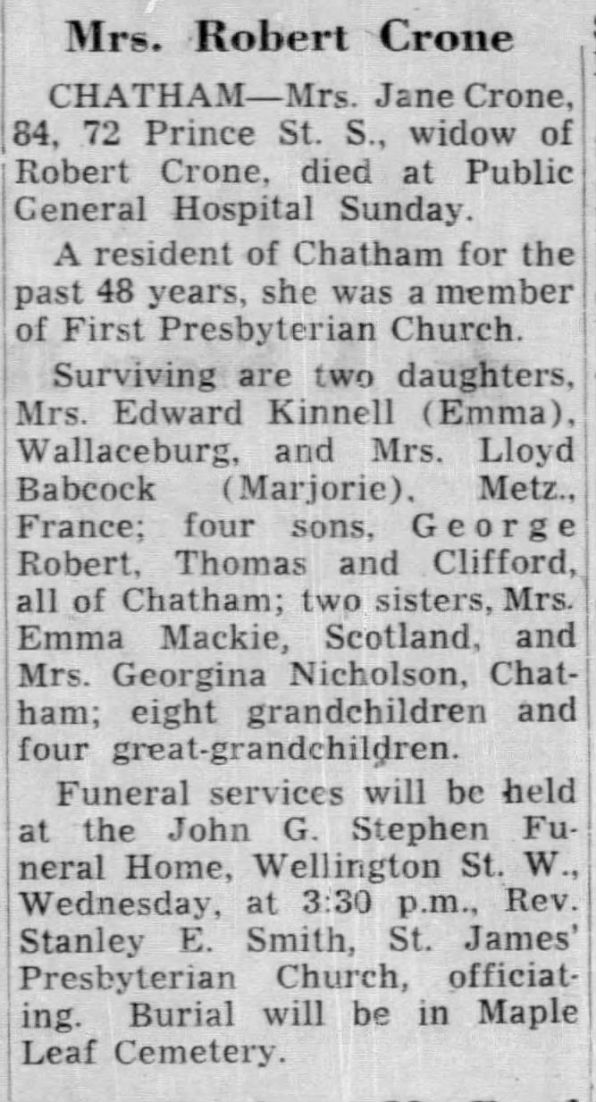 Family Search: When Private Robert Crone was born on 11 June 1883, in Annan, Dumfriesshire, Scotland, United Kingdom, his father, William Crone, was 38 and his mother, Robina Bell, was 38. He married Jane Byers in 1900, in Scotland, United Kingdom. They were the parents of at least 4 sons and 2 daughters. He immigrated to Canada in 1912. He registered for military service in 1916. In 1919, his occupation is listed as shipping clerk in Chatham, Kent, Ontario, Canada. He died on 25 March 1949, in Chatham, Kent, Ontario, Canada, at the age of 65, and was buried in Maple Leaf Cemetery, Chatham, Chatham-Kent, Ontario, Canada.