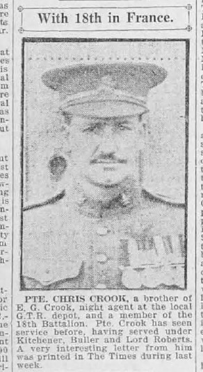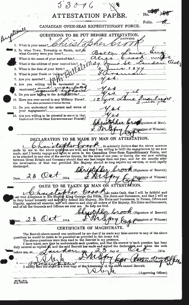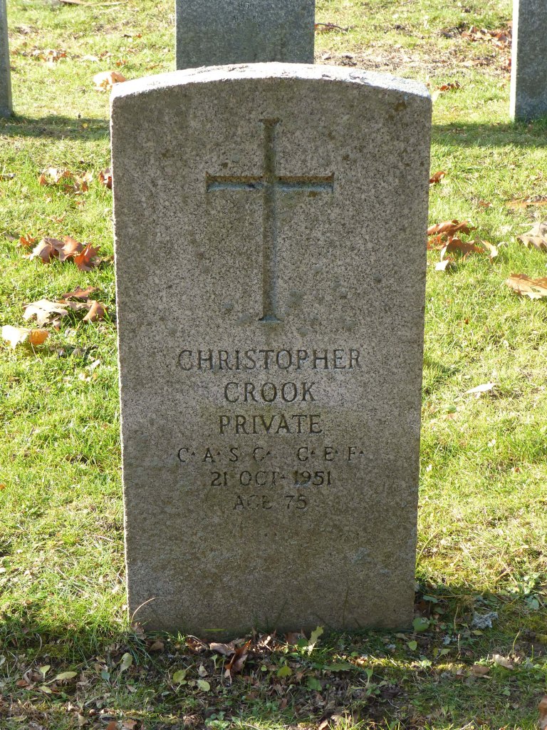 Family Search: Private Christopher Crook was born on 3 June 1876, in Bolton, Lancashire, England, United Kingdom. He married Alice Crook on 25 February 1905, in Lever Bridge, Lancashire, England, United Kingdom. He immigrated to Canada in 1913 and lived in London, Ontario, Canada in 1918. He registered for military service in 1914. In 1914, at the age of 38, his occupation is listed as fireman in London, Ontario, Canada. He died on 21 October 1951, in Hamilton, Hamilton-Wentworth, Ontario, Canada, at the age of 75, and was buried in Woodland Cemetery, Hamilton, Hamilton-Wentworth, Ontario, Canada.
