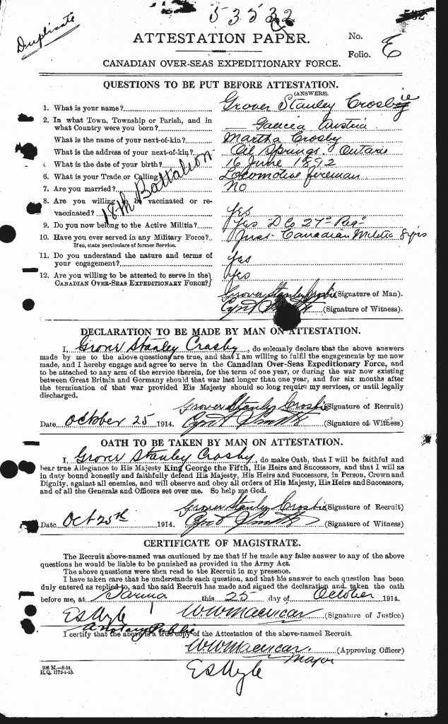 13737-27 Grover Stanley CROSBIE, 34, driller, Langeais Austria, Petrolia, s/o Gilbert Samuel CROSBIE, b. Sarnia & Martha WALLEN, married Frances Louise BARRETT, 27, Petrolia, same, d/o Charles H. BARRETT, b. Petrolia & Helena MCVICAR, witn: Frank PERKINS of Chatham & Mrs. James H. PARK of Ashtabula Ohio, 19 Nov 1927 at Petrolia
