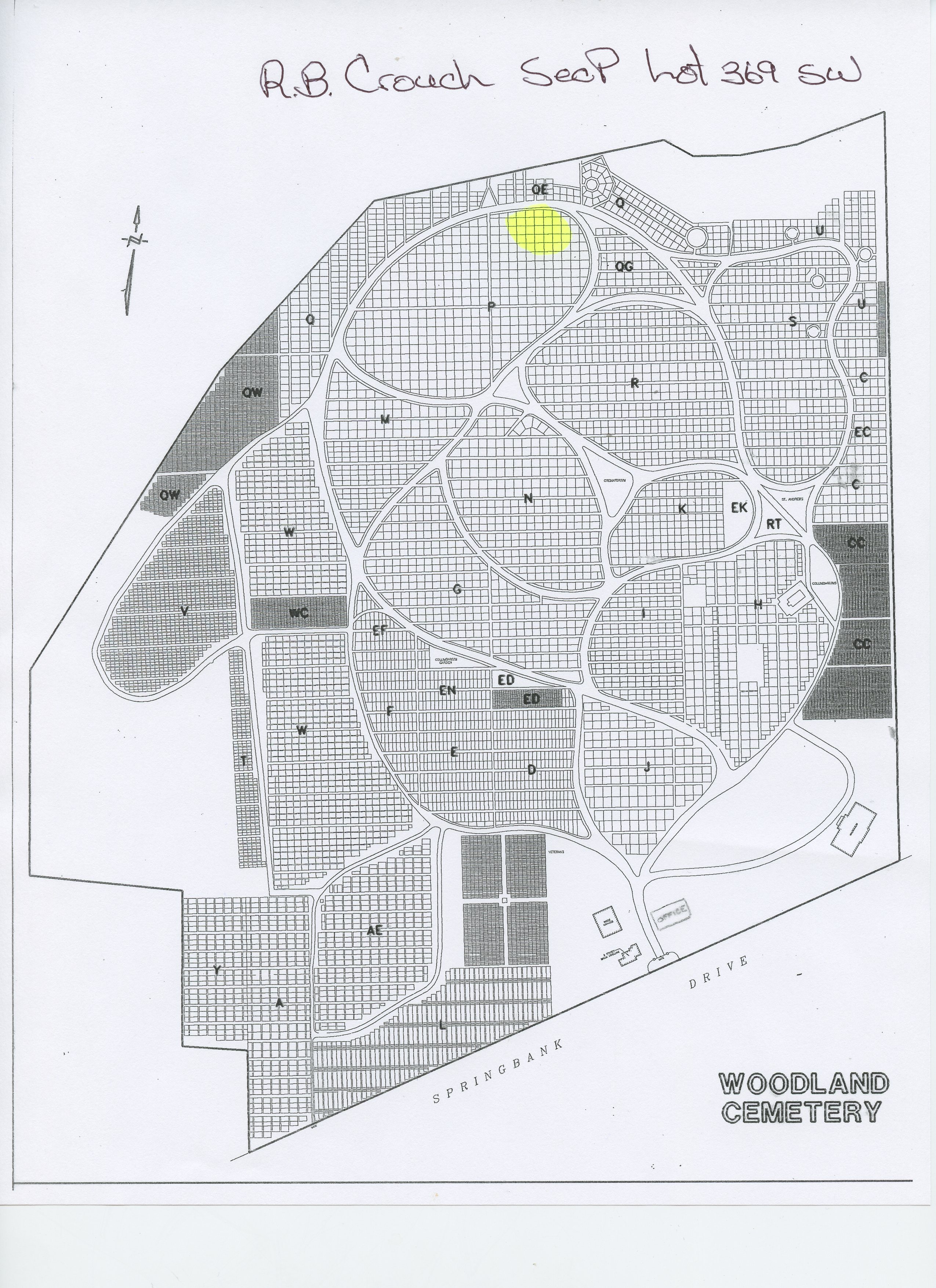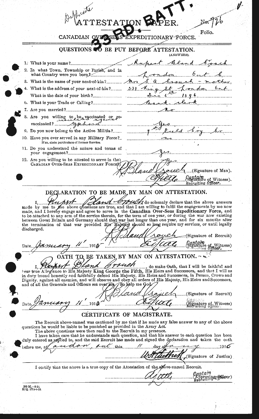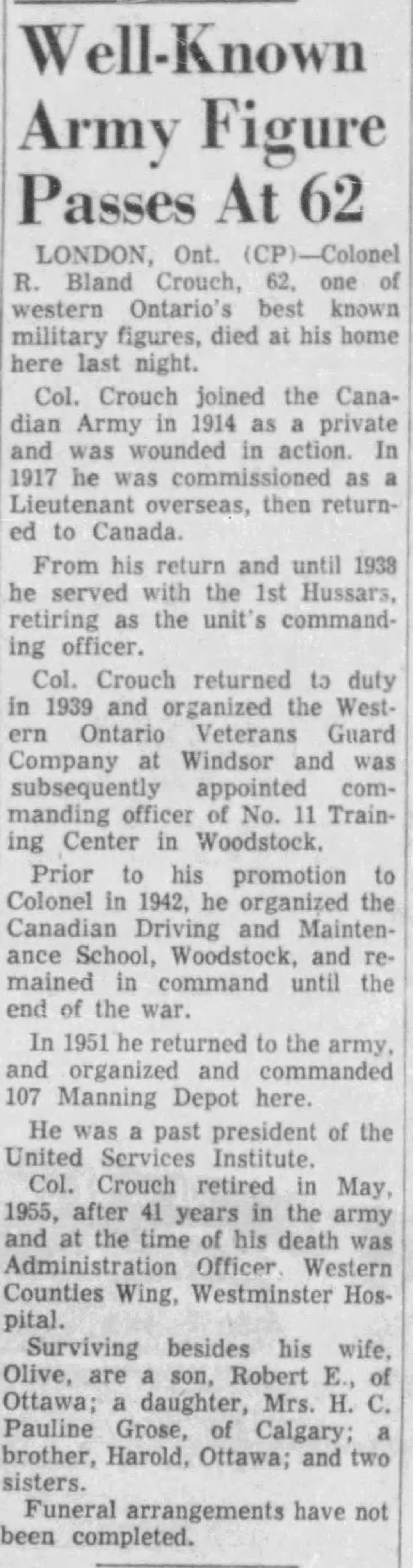 Family Search: When Lieutenant Rupert Bland Crouch was born on 6 December 1896, in London, Canada West, British North America, his father, Alfred Edward Crouch, was 44 and his mother, Sarah Ann Bland, was 41. He married Olive on 14 April 1917, in London, England, United Kingdom. They were the parents of at least 1 son and 2 daughters. He registered for military service in 1915. In 1915, at the age of 19, his occupation is listed as bank clerk in London, Ontario, Canada. He died on 17 December 1958, in London Township, Middlesex, Ontario, Canada, at the age of 62, and was buried in Woodland Cemetery, London, Ontario, Canada.
