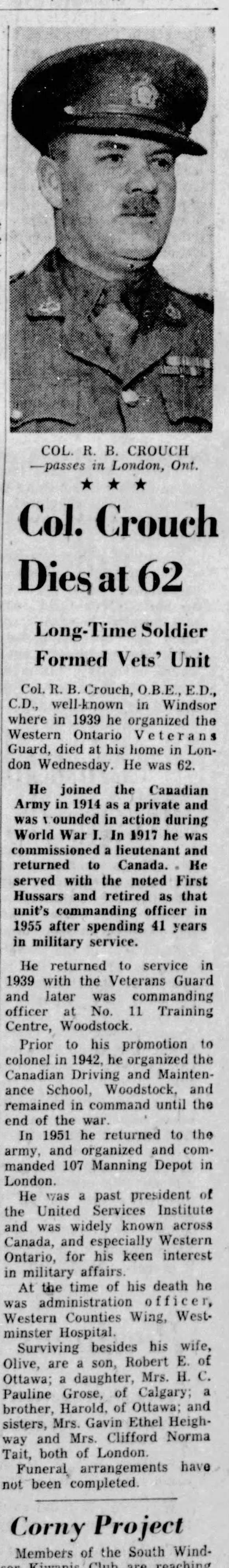 “Rupert Bland Crouch was born to on December 6, 1896 at London, Ontario where he resided, attended school and later worked as a bank clerk. On January 11, 1915 he enlisted in the CEF with the 18th Battalion, going overseas with the 33rd Battalion when he suffered wounds and was placed with the 4th Reserve Battalion, then the 1st Co. Signals as a Lieutenant. When discharged he was employed in Toronto then London becoming a member of the 1st Hussars Non-Permanent Active Militia (NPAM) June 1920 until January 1938. In 1939 he returned to active service, organizing a Western Ontario Veterans Guard Co. at Windsor, Ontario. His next appointment was August 1, 1940 as Commanding Officer, No. 11 Training Center in Woodstock (later known as the Canadian Driving and Maintenance School). In December 1942, he was promoted to Colonel. Crouch retired, until 1951 when he organized and commanded 107 Manning Depot in London, Ontario. He also served as an administrative officer of Westminster Hospital London, Ontario. Col. Crouch passed away in 1958 at the age of 62.” – written by Keith Armstrong, Military Historian