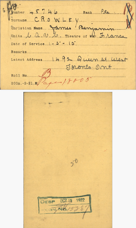 Family Search: Private James Benjamin Crowley was born on 8 November 1890, in Dublin, County Dublin, Ireland as the son of Father Crowley. He lived in Toronto, Ontario, Canada in 1922. He registered for military service in 1914. In 1914, at the age of 24, his occupation is listed as clerk.