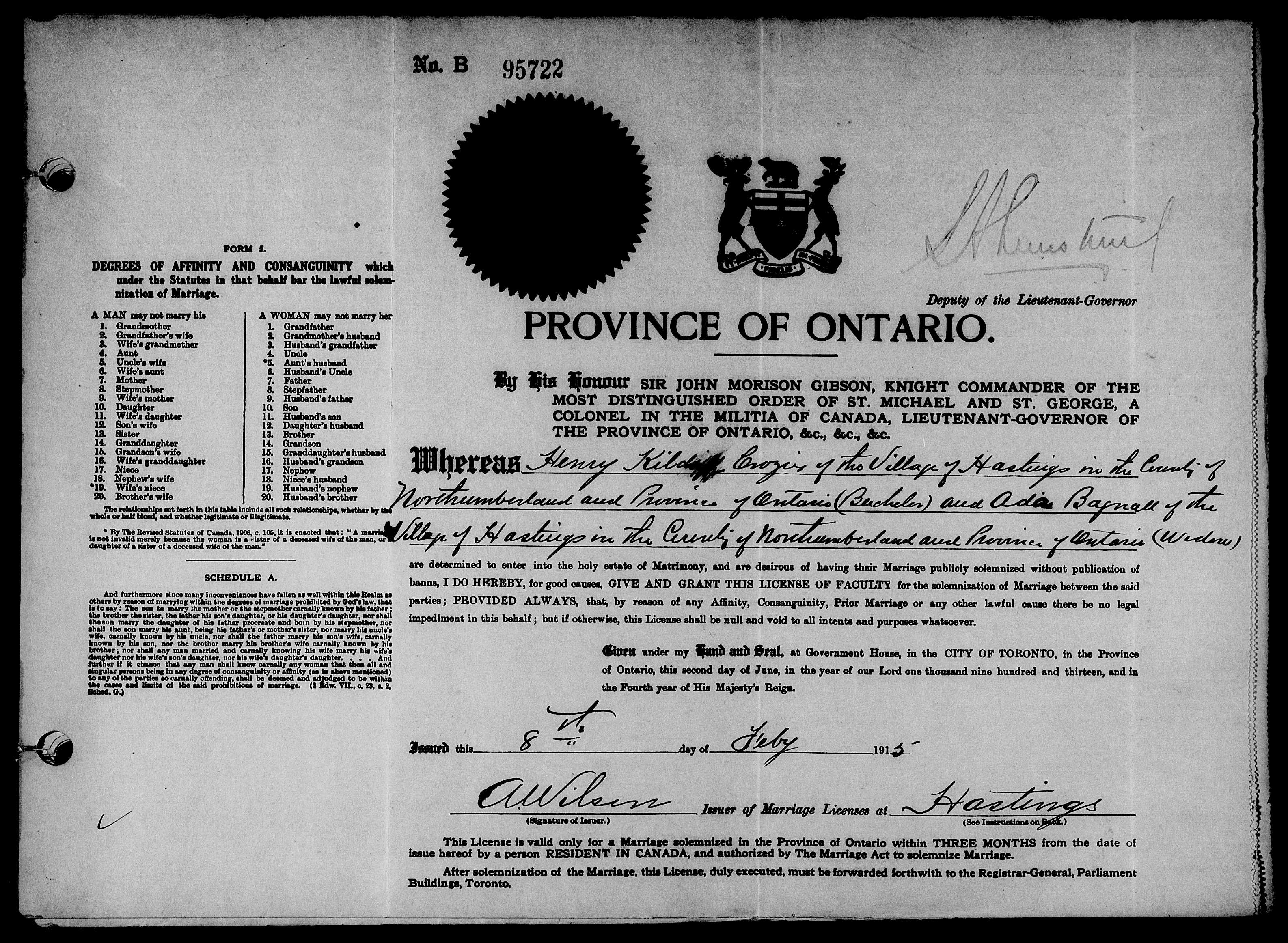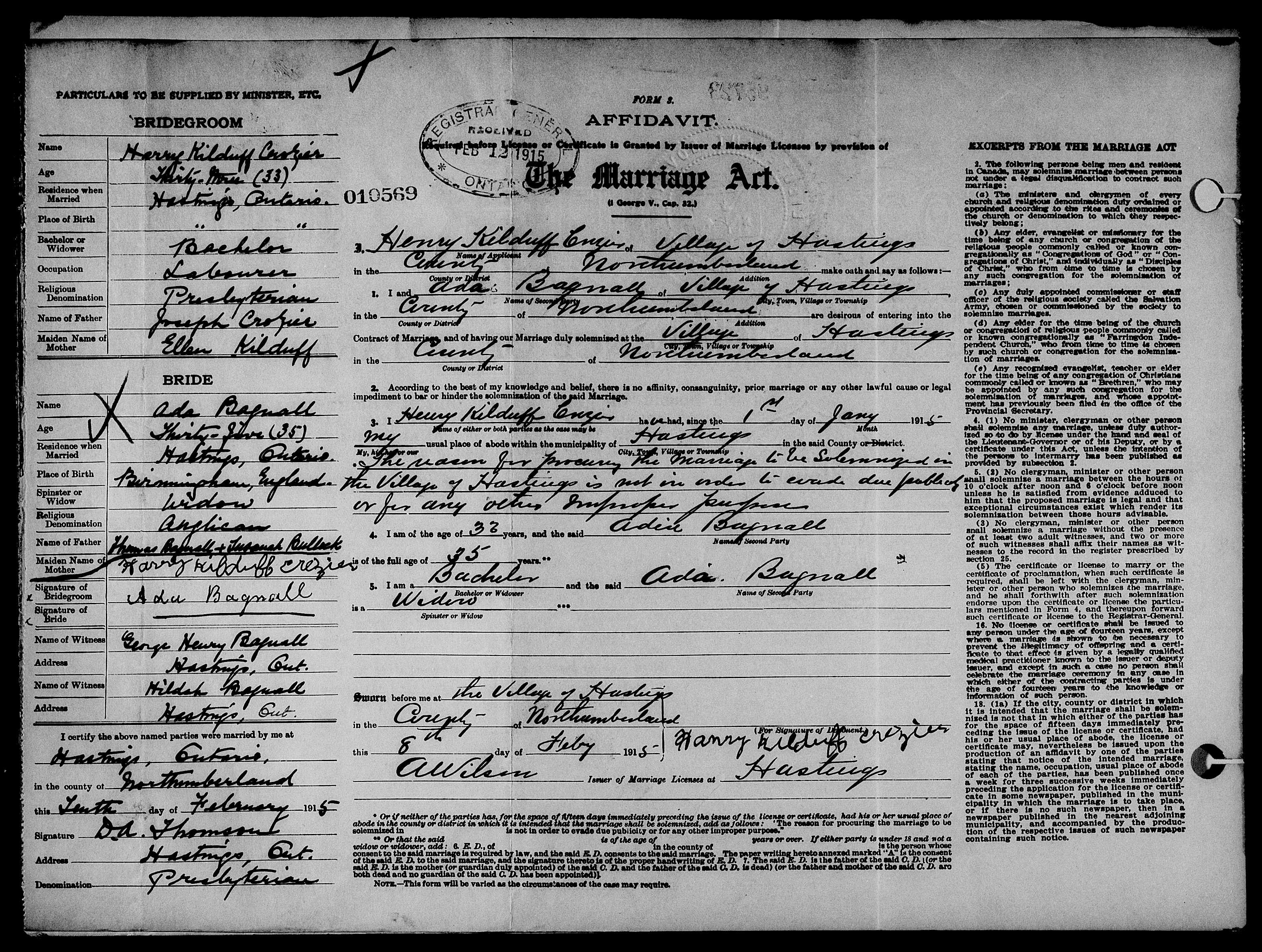 Family Search: When Private Henry Kilduff Crozier was born on 10 September 1882, in Hastings, Ontario, Canada, his father, Joseph Crozier, was 36 and his mother, Ellen Killduff, was 38. He married Ada Kempt Bagnall on 8 February 1915, in Hastings, Northumberland, Ontario, Canada. They were the parents of at least 1 son and 1 daughter. He lived in Alnwick Township, Northumberland, Ontario, Canada in 1891 and Northumberland, Ontario, Canada in 1901. He registered for military service in 1916. In 1916, at the age of 34, his occupation is listed as labourer in Hastings, Northumberland, Ontario, Canada. He died on 3 December 1956, in Toronto, Ontario, Canada, at the age of 74, and was buried in Riverside Cemetery, Lindsay, Victoria, Ontario, Canada.