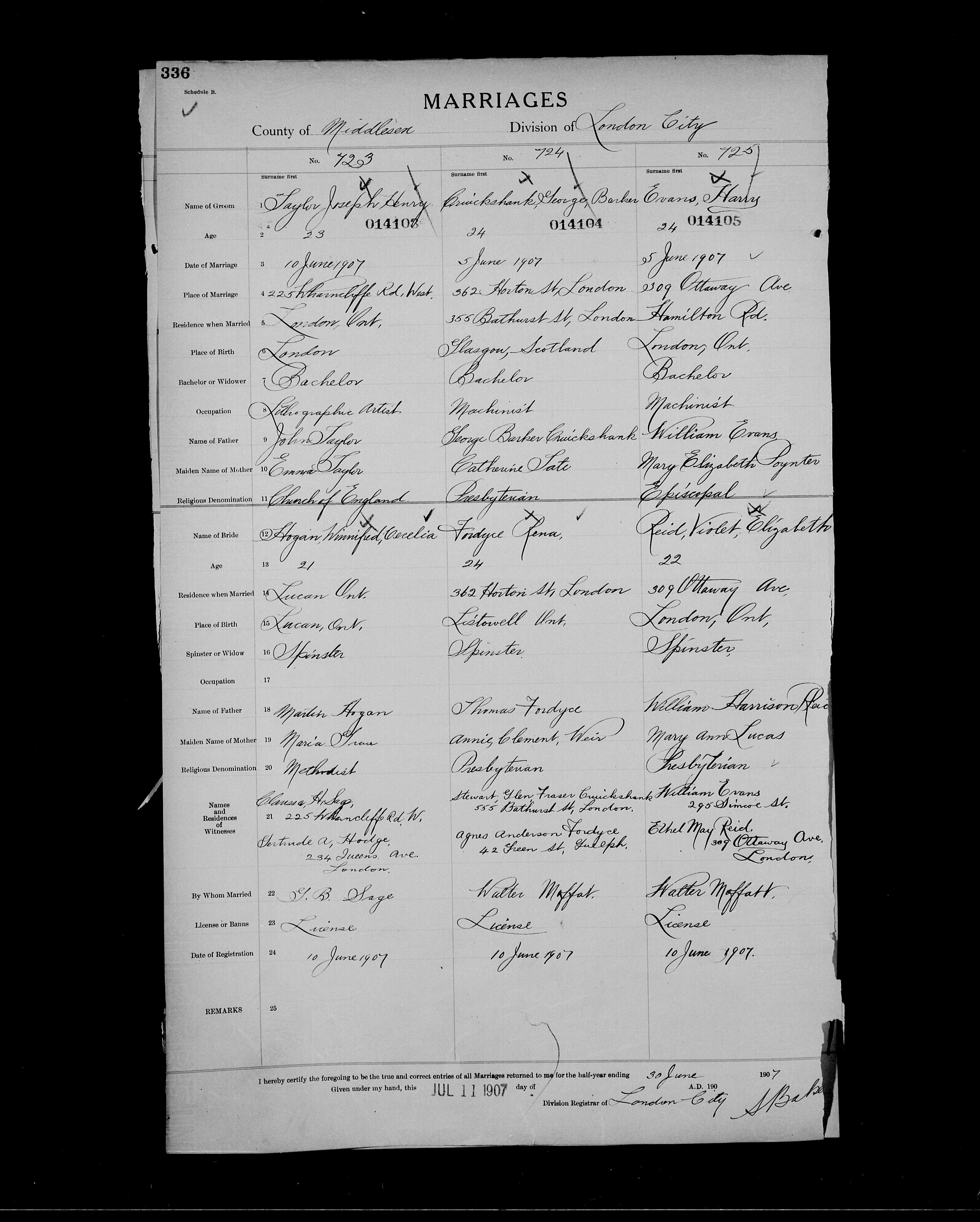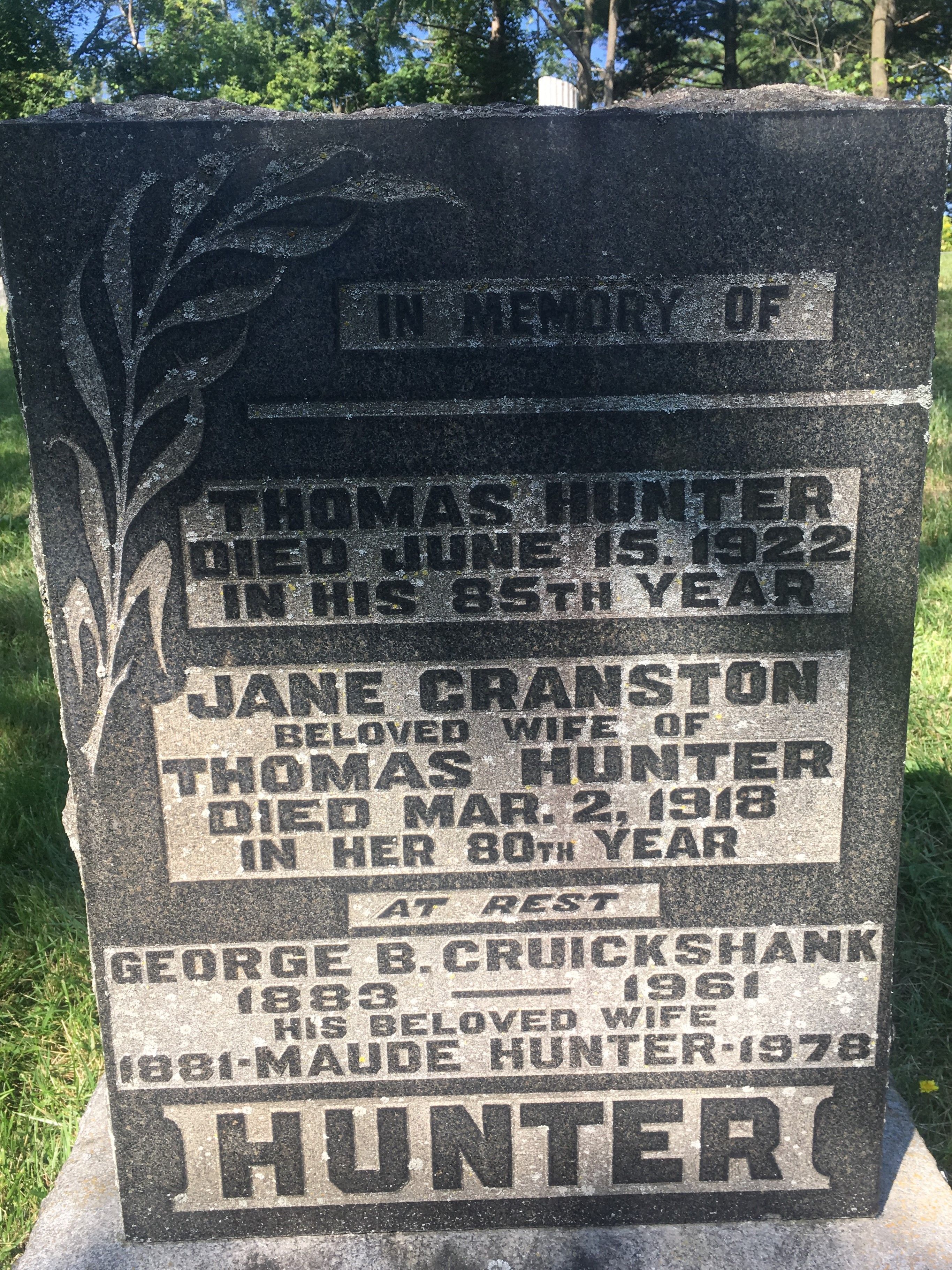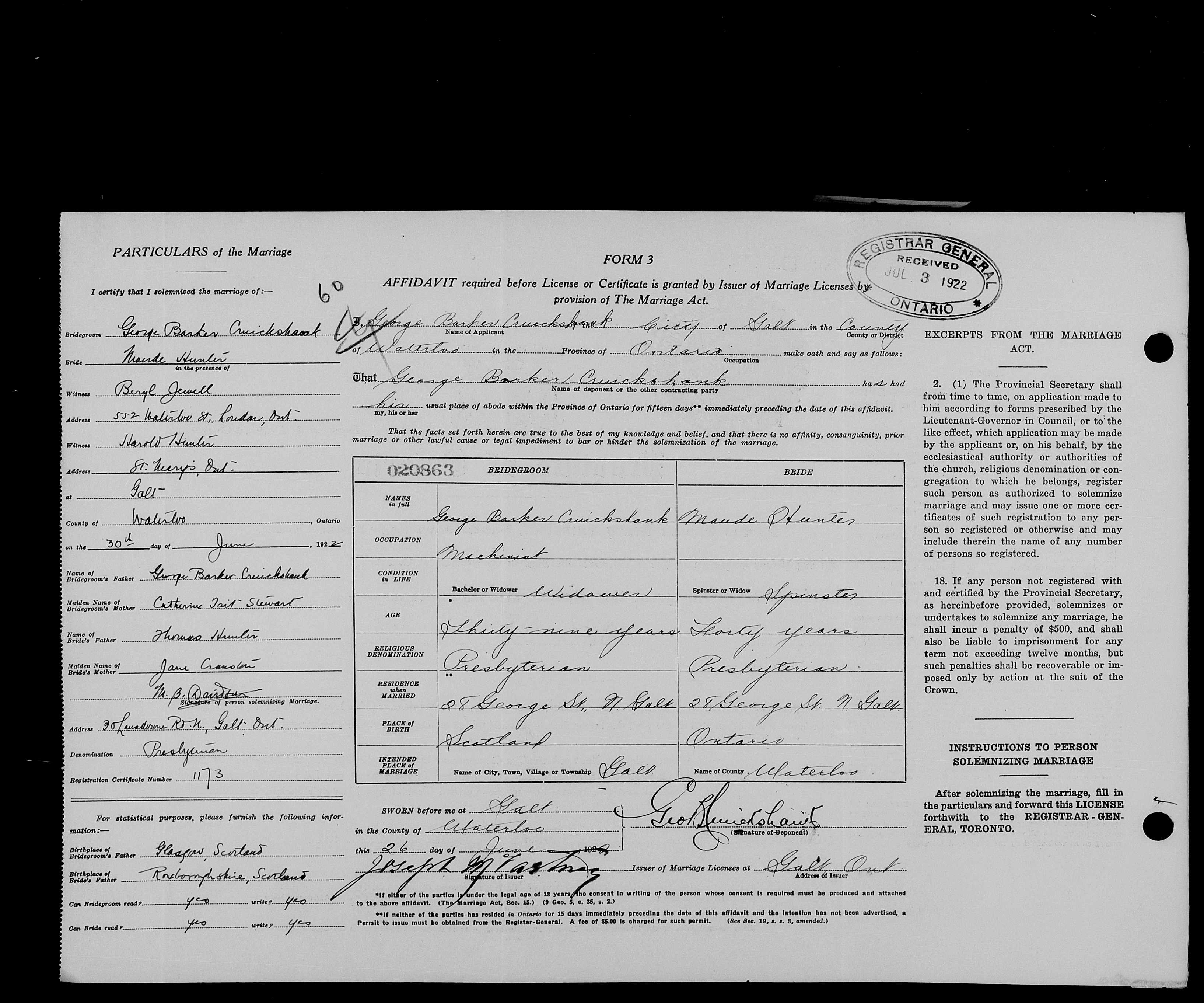 Family Search: When George Barker Cruickshank was born on 9 January 1883, in Glasgow, Lanarkshire, Scotland, United Kingdom, his father, George Barker Cruickshank, was 31 and his mother, Catherine Tait Stewart, was 31. He married Maud Hunter on 30 June 1922, in Waterloo, Ontario, Canada. He immigrated to Canada in 1907. He registered for military service in 1914. In 1914, at the age of 31, his occupation is listed as machinist. He died on 8 October 1961, in Ontario, Canada, at the age of 78, and was buried in Mount View Cemetery, Cambridge, Waterloo, Ontario, Canada.