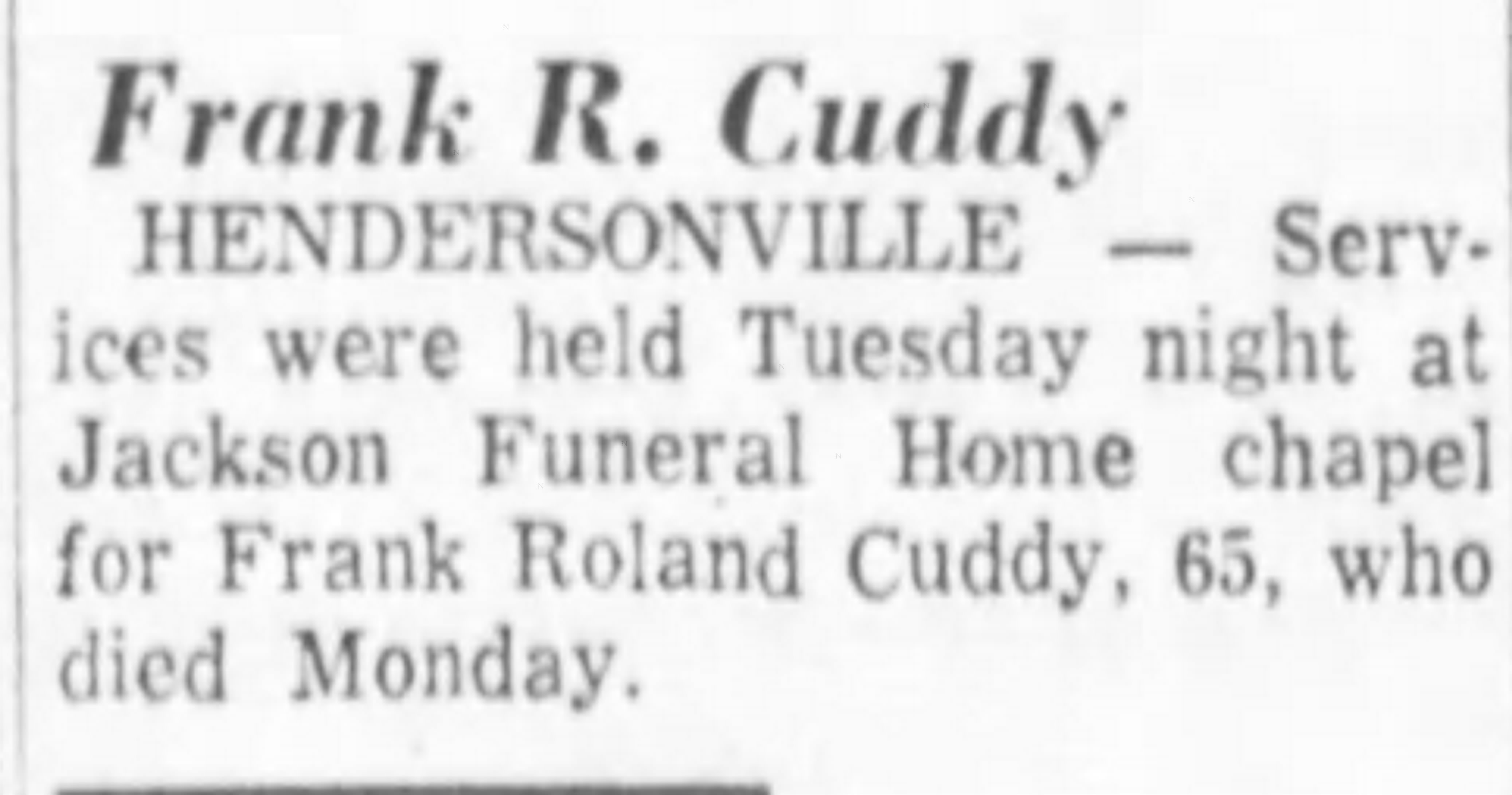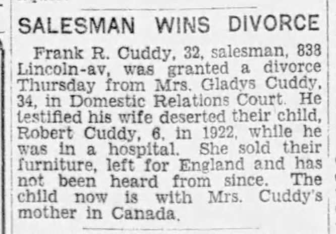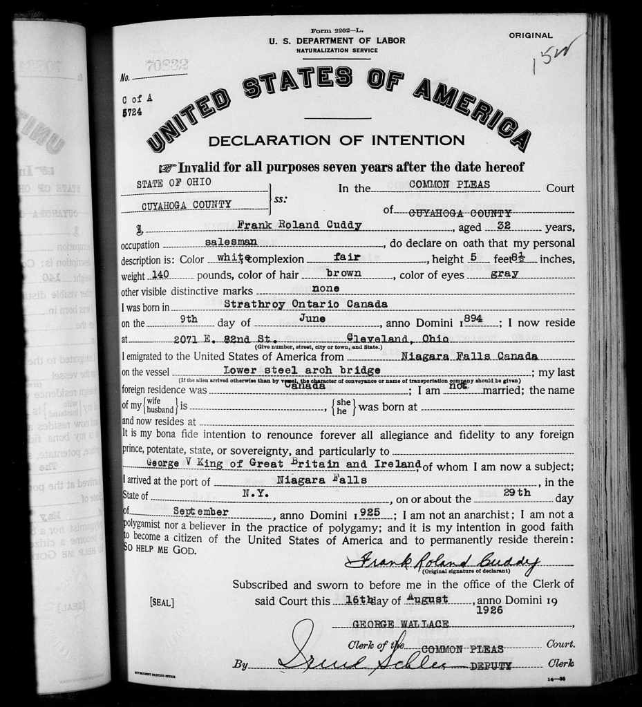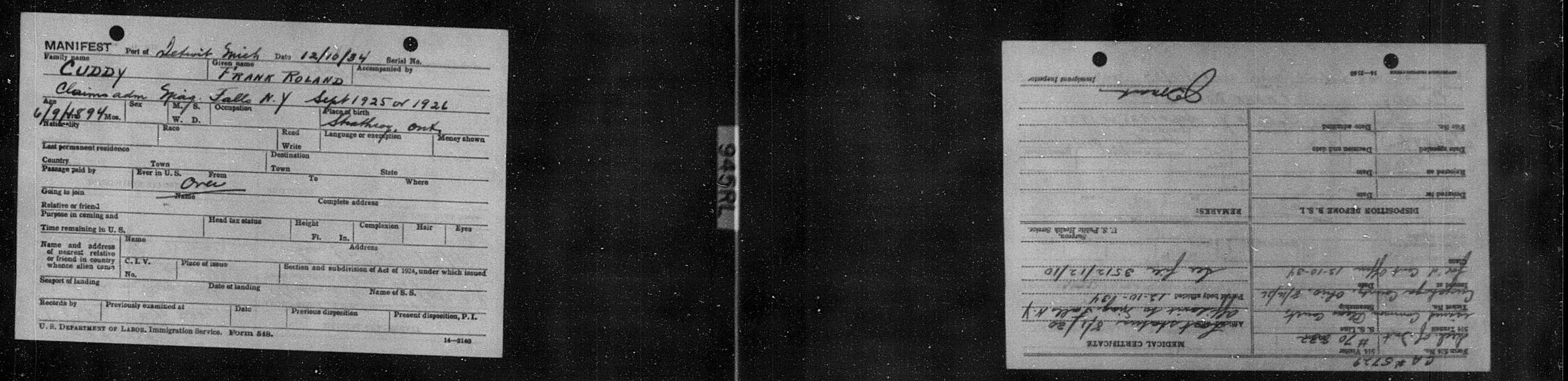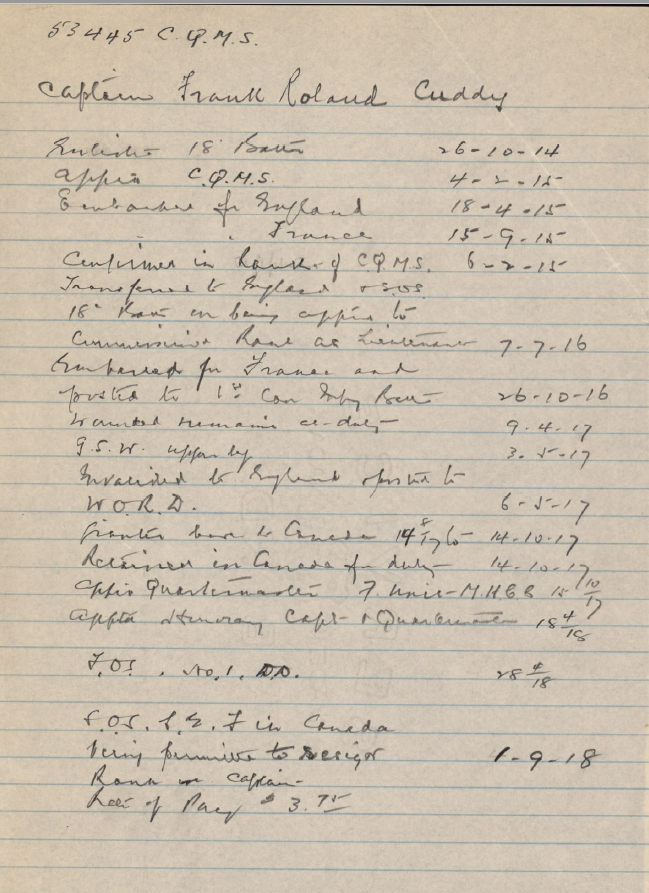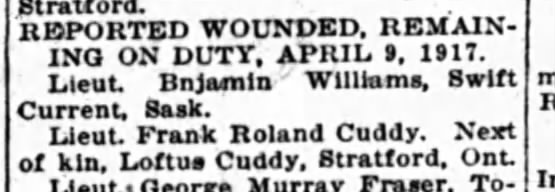 Family Search: When Lieutenant Frank Roland Cuddy was born on 9 June 1894, in Strathroy, Middlesex, Ontario, Canada, his father, Loftus William James Cuddy, was 36 and his mother, Bessie Sutherland, was 35. He married Gladys O’Reilly on 3 January 1920, in Toronto, York, Ontario, Canada. They were the parents of at least 1 son. He lived in Middlesex, Ontario, Canada for about 10 years. He registered for military service in 1914. In 1914, at the age of 20, his occupation is listed as student-at-law in Strathroy, Middlesex, Ontario, Canada. He died on 25 April 1960, in Henderson, North Carolina, United States, at the age of 65.