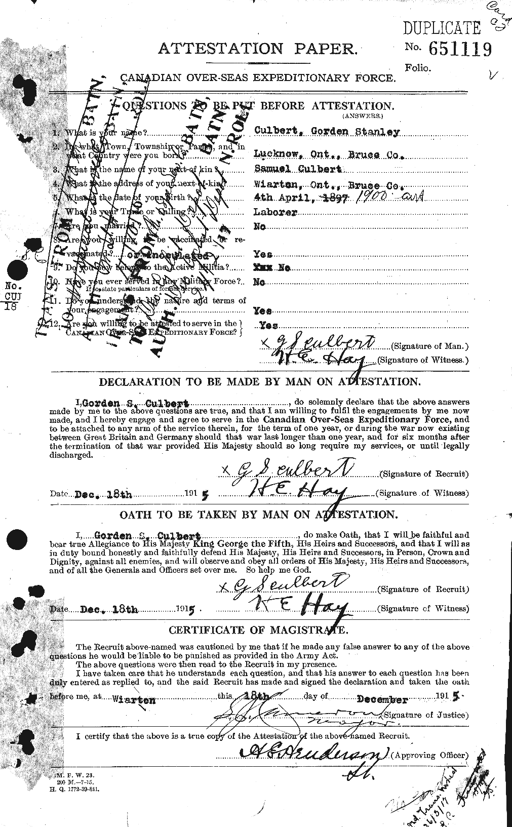 Family Search: When Gordon Stanley Culbert was born on 4 April 1900, in West Wawanosh, Huron, Ontario, Canada, his father, Samuel Culbert, was 38 and his mother, Rachel Mcleod, was 32. He married Lottie Violet Rambo on 20 January 1923, in Ontario, Canada. He lived in Huron, Ontario, Canada in 1901 and Bruce, Ontario, Canada in 1911. He died in 1984, at the age of 84, and was buried in Saint James Cemetery, Clandeboye, Lucan Biddulph, Middlesex, Ontario, Canada.