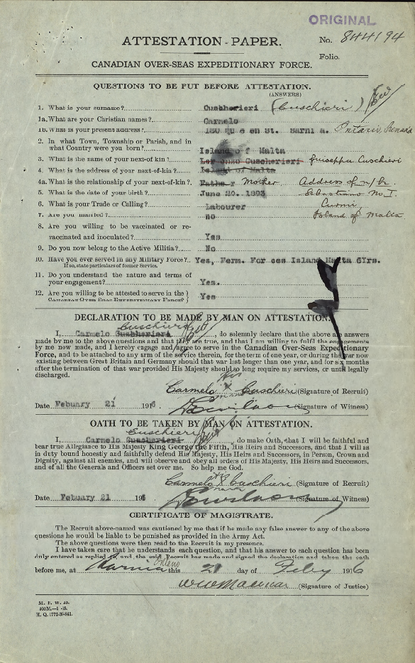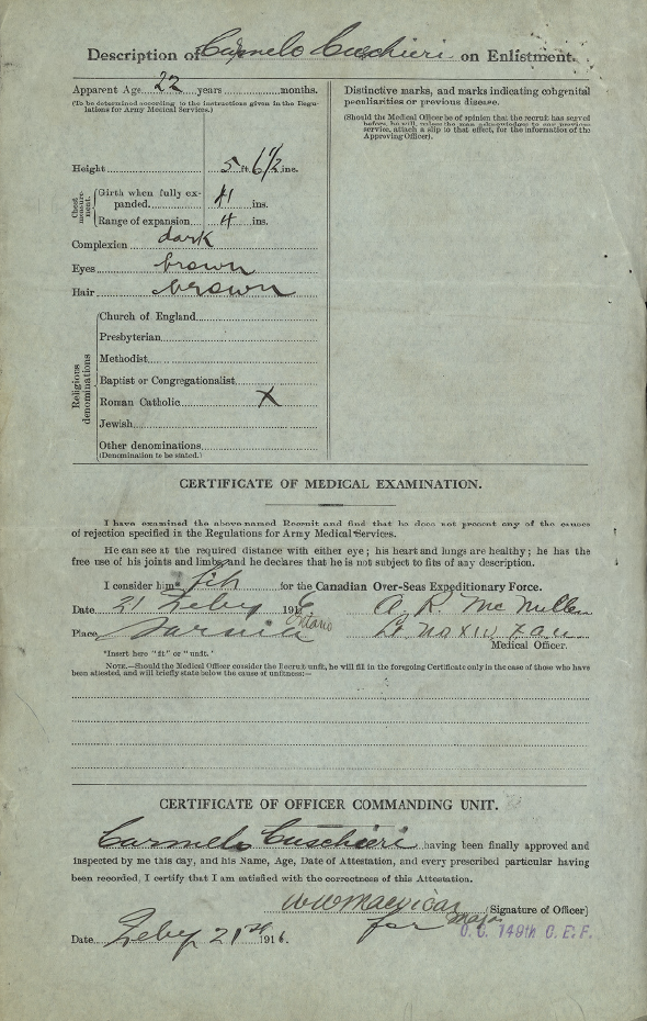 Family Search: Private Carmelo Cuschieri was born on 24 September 1895, in Malta as the son of Lorenzo Cuschieri and Carmela Cuschieri. He married Maria Borg on 17 October 1927, in Qormi, Malta. They were the parents of at least 3 sons and 2 daughters. He immigrated to New York City, New York, United States in 1939 and lived in Montreal, Quebec, Canada in 1917 and Detroit, Wayne, Michigan, United States in 1930. He registered for military service in 1917. In 1917, at the age of 22, his occupation is listed as fireman in Montreal, Quebec, Canada.