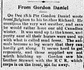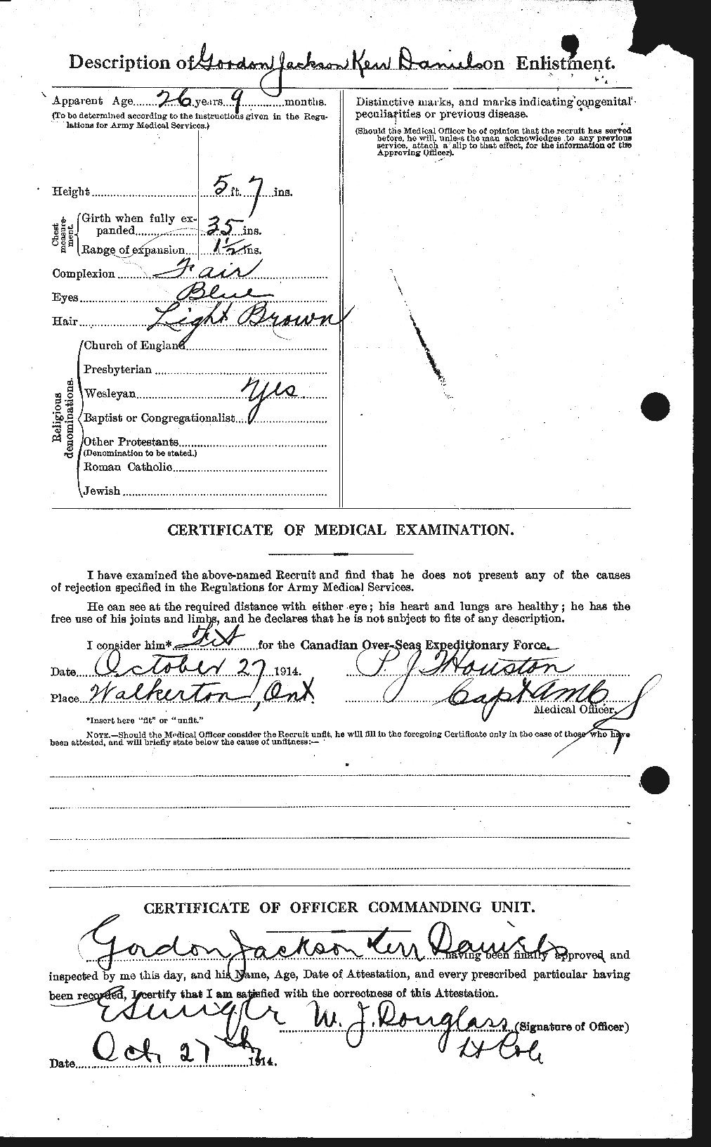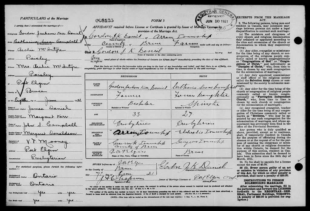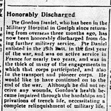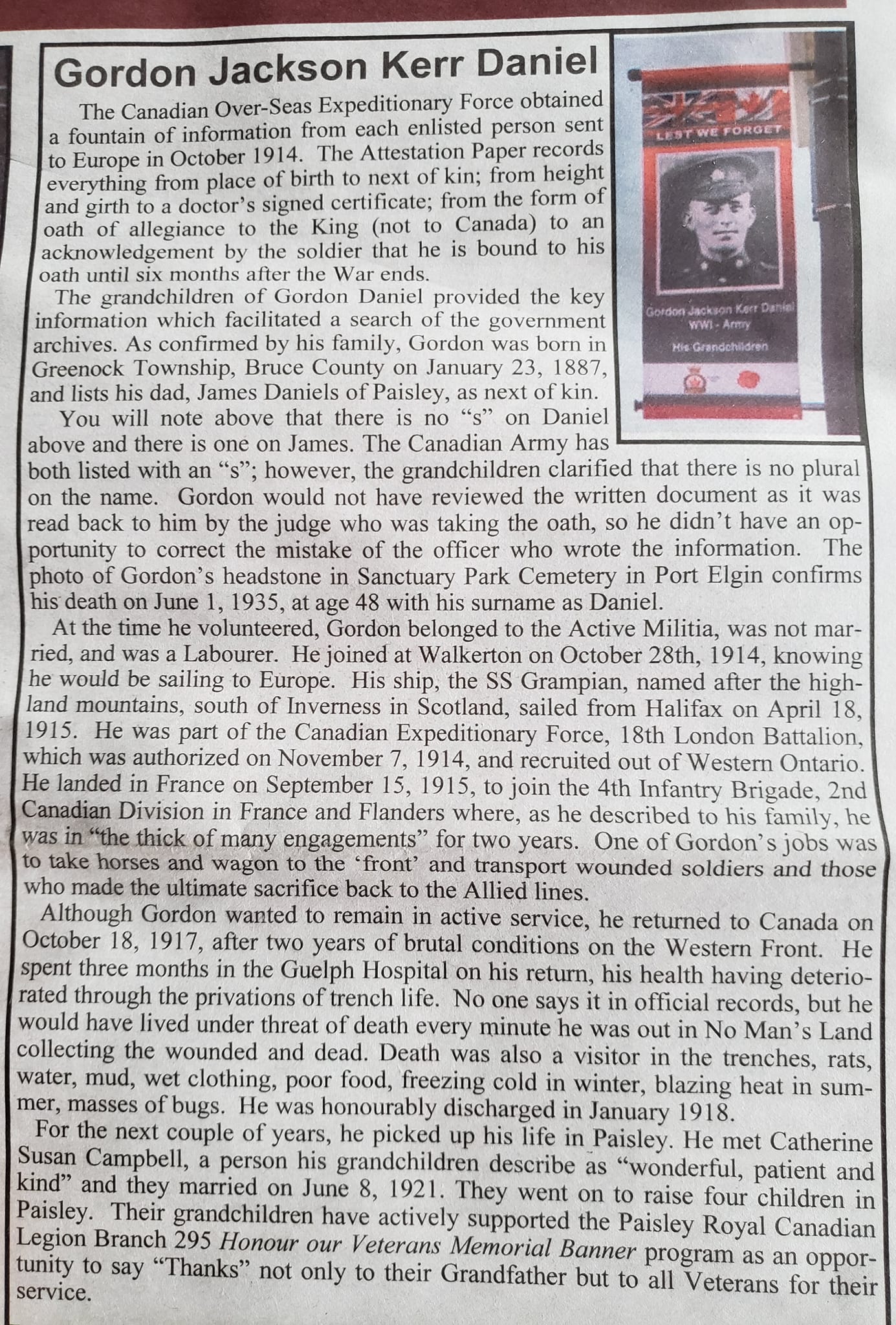 The grandchildren of Gordon Daniel provided the key information which facilitated a search of the government archives. As confirmed by his family, Gordon was born in Greenock Township, Bruce County on January 23, 1887, and lists his dad, James Daniels of Paisley, as next of kin.