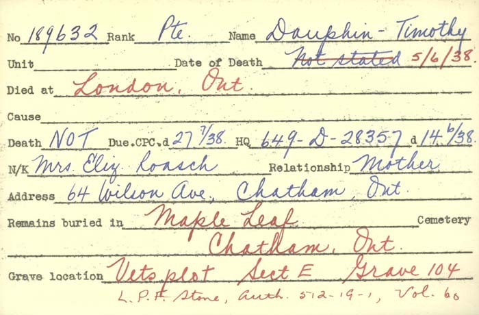 Family Search: Private Timothy Dauphin was born on 5 April 1896, in Chatham, Kent, Ontario, Canada as the son of Elizabeth. He registered for military service in 1915. In 1915, at the age of 19, his occupation is listed as labourer in Chatham, Kent, Ontario, Canada. He died on 5 June 1938, in London, Ontario, Canada, at the age of 42, and was buried in Maple Leaf Cemetery, Chatham, Chatham-Kent, Ontario, Canada.