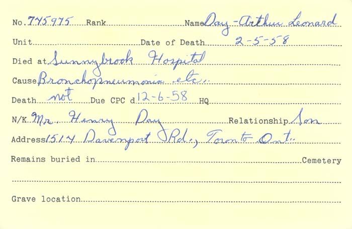 Family Search: Arthur Leonard Day was born on 28 April 1872, in London, England, United Kingdom. He had at least 1 son with Martha Peroue. He immigrated to Canada in 1913 and lived in Oshawa, Ontario, Ontario, Canada in 1916. He registered for military service in 1916. In 1916, at the age of 44, his occupation is listed as labourer in Oshawa, Ontario, Ontario, Canada. He died on 2 May 1958, in Toronto, Ontario, Canada, at the age of 86, and was buried in Mount Lawn Memorial Park, Oshawa, Ontario, Ontario, Canada.