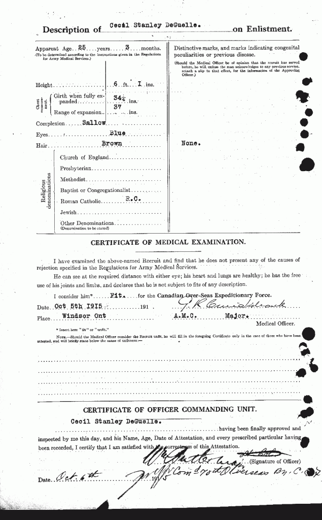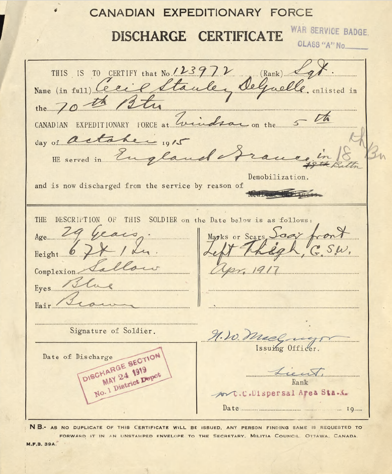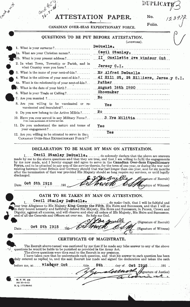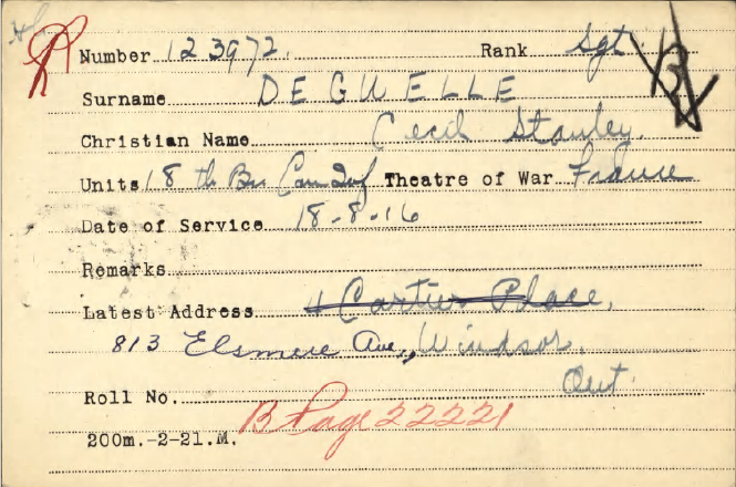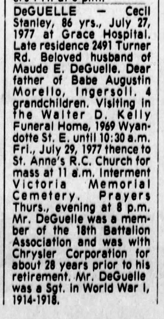 Family Search: When Private Cecil Stanley DeGuelle was born in 1890, in Jersey, his father, Alfred De Guelle, was 40 and his mother, Elizabeth Fogarty, was 31. He had at least 1 daughter with Maude E.. He immigrated to Detroit, Wayne, Michigan, United States in 1924 and lived in Saint Helier, Jersey for about 10 years. He registered for military service in 1915. In 1928, his occupation is listed as chrysler corporation in Windsor, Essex, Ontario, Canada. He died on 27 July 1977, in Windsor, Essex, Ontario, Canada, at the age of 87, and was buried in Victoria Memorial Gardens, Oldcastle, Essex, Ontario, Canada.