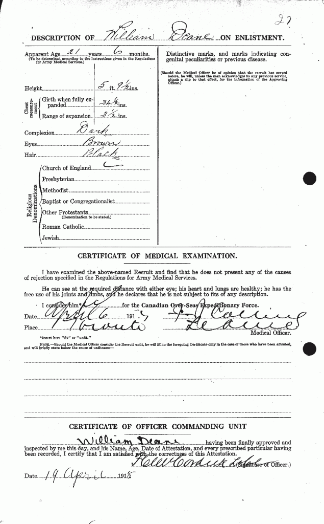 William Deane (born County Cork, Ireland 22 September 1893/4) enlisted with the 35th Battalion at Toronto, Ontario on 12 April 1915. He was assigned to Company “B”.