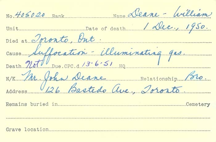 Family Search: Private William Deane was born on 22 September 1894, in County Cork, Ireland as the son of Esther. He immigrated to Quebec City, Quebec, Canada in 1914. He registered for military service in 1915. In 1915, at the age of 21, his occupation is listed as labourer in Toronto, York, Ontario, Canada. He died on 1 December 1950, in Toronto, Ontario, Canada, at the age of 56, and was buried in Mount Pleasant Cemetery, Toronto, Ontario, Canada.