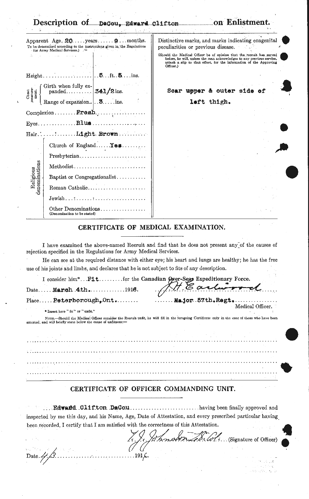 Family Search: When Private Edward Clifton De Cou was born on 13 June 1895, in Chatham, Kent, Ontario, Canada, his father, Lemuel Clifton Decou, was 36 and his mother, Julia Ann Buller, was 37. He married Jessie Honor Elliott on 23 June 1924, in Vancouver, British Columbia, Canada. They were the parents of at least 1 son and 1 daughter. He lived in Rush Point, Havelock-Belmont-Methuen, Peterborough, Ontario, Canada in 1916. He registered for military service in 1916. In 1916, at the age of 21, his occupation is listed as teacher in Rush Point, Havelock-Belmont-Methuen, Peterborough, Ontario, Canada. He died on 1 January 1975, in Vancouver, British Columbia, Canada, at the age of 79.