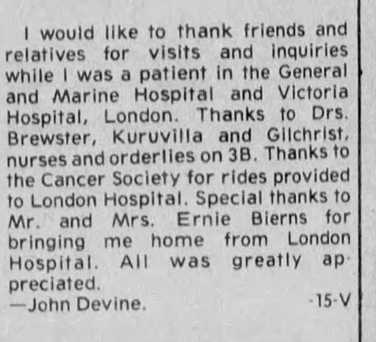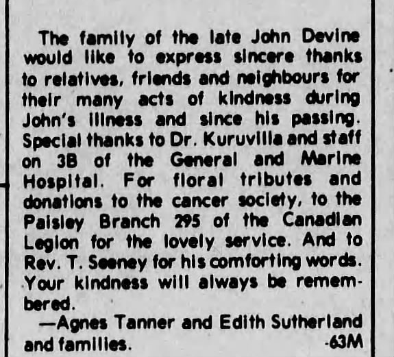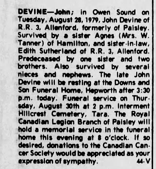 Family Search: Private William John Devine was born on 5 July 1898, in Paisley, Bruce, Ontario, Canada. He registered for military service in 1916. In 1916, at the age of 18, his occupation is listed as butcher in Paisley, Bruce, Ontario, Canada. He died on 28 August 1979, at the age of 81, and was buried in Hillcrest Cemetery, Tara, Bruce, Ontario, Canada.