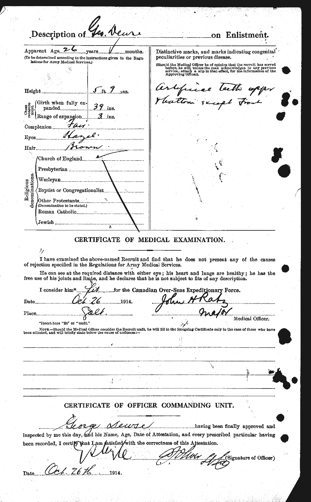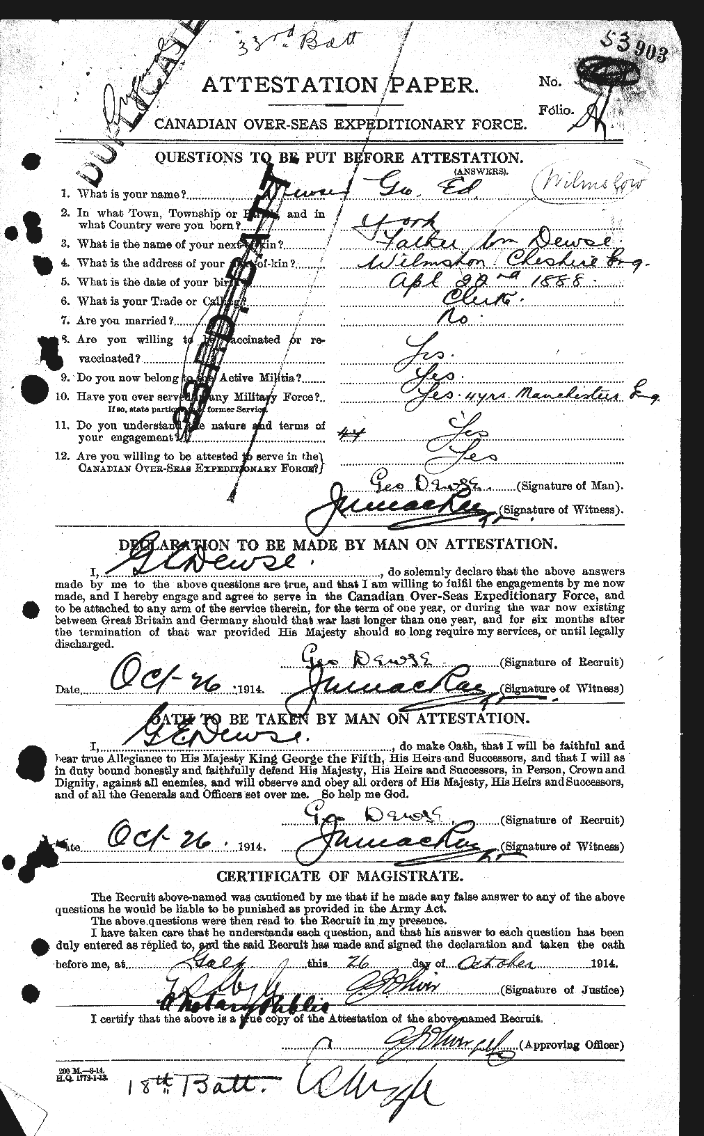 Dewse, George Edward: Service No. 53903 Digitized Service Record Attestation paper one number past my Grandfather’s. Find-A-Grave Family Search Share this: Click to email a link to a friend (Opens in new window) Email Click to share on Facebook (Opens in new window) Facebook Click to share on X (Opens in new window) X Click to share on Reddit (Opens in new window) Reddit Click to share on LinkedIn (Opens in new window) LinkedIn Click to print (Opens in new window) Print Click to share on Tumblr (Opens in new window) Tumblr Click to share on Pocket (Opens in new window) Pocket Click to share on Pinterest (Opens in new window) Pinterest Click to share on Telegram (Opens in new window) Telegram Click to share on WhatsApp (Opens in new window) WhatsApp Like Loading... Leave a comment Cancel reply Δ This site uses Akismet to reduce spam. Learn how your comment data is processed.