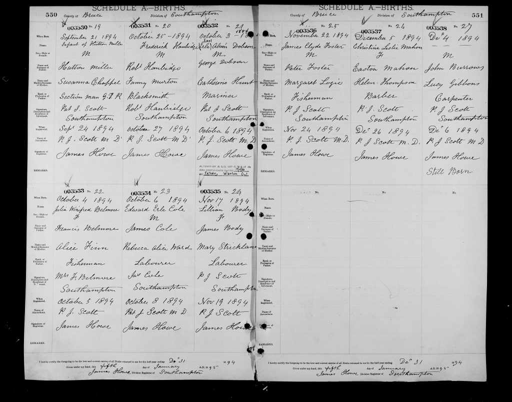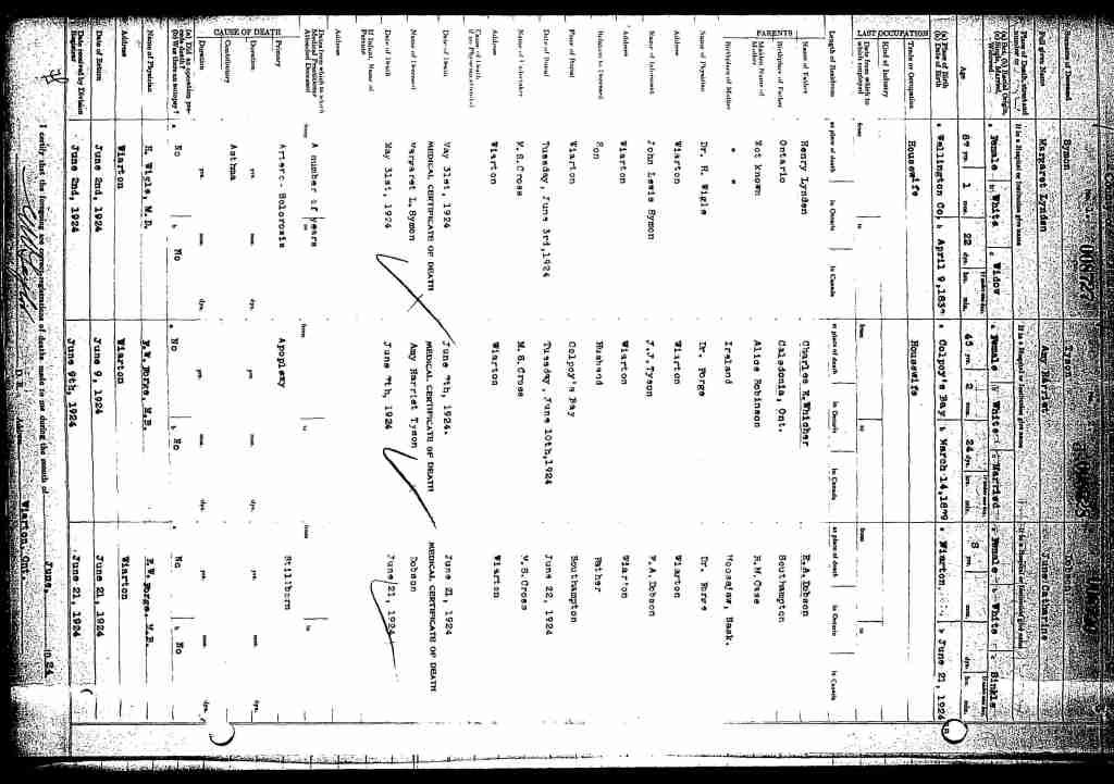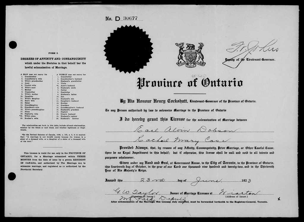 008281/23 (Bruce Co) Earl Alvin DOBSON, 28, civil servant, Southampton, Wiarton, s/o George T. DOBSON (b. Southampton Ont) & Catherine HUNT, married Rachel Mary CASE, 28, nurse, Moosejaw, Wiarton, d/o Joseph CASE (b. Blanchard Ont) & Hannah COLLISON, witn: J.C. CASE of Owen Sound & Leonard E. DOBSON of Wiarton, 27 June 1923, Wiarton