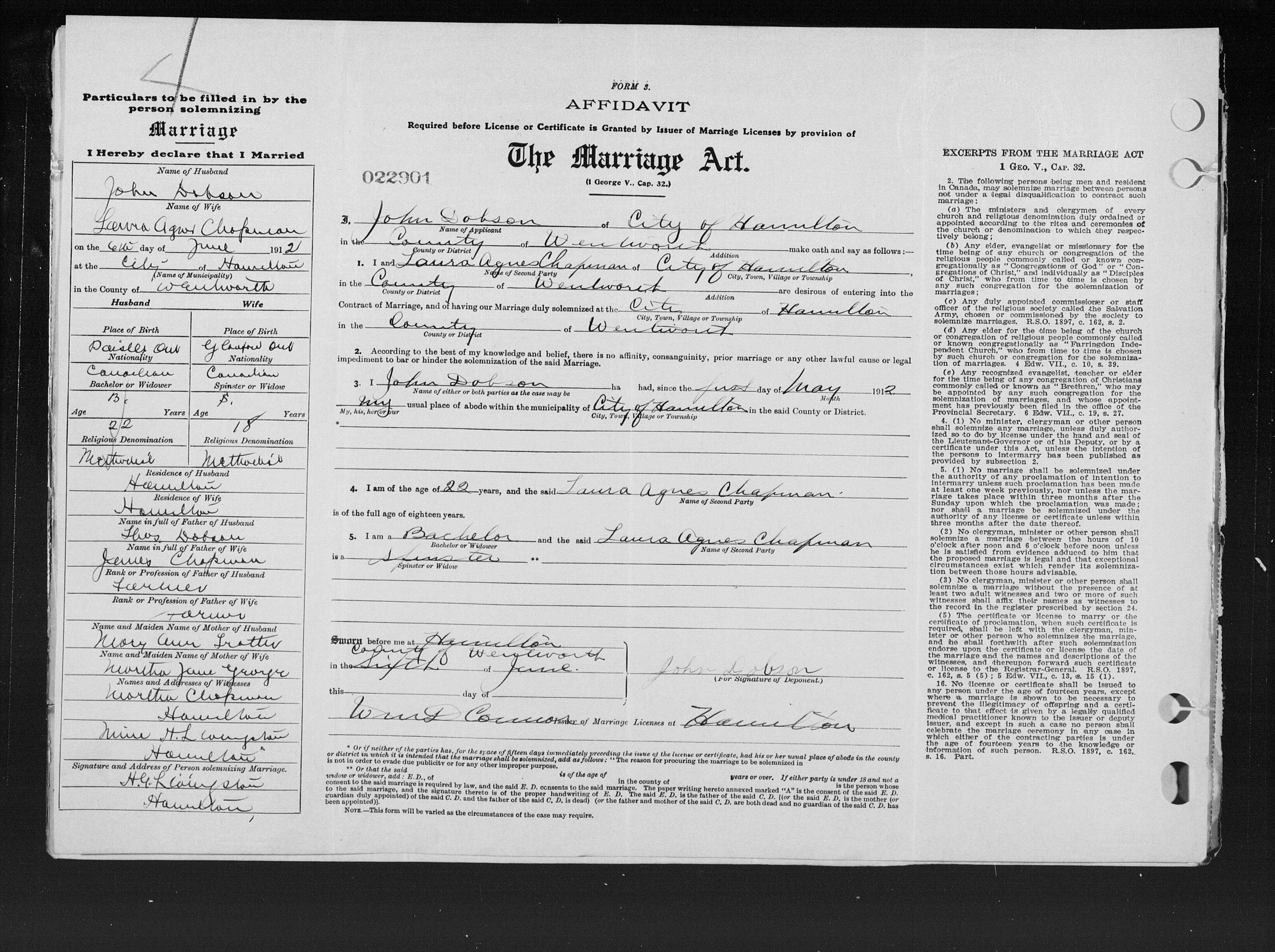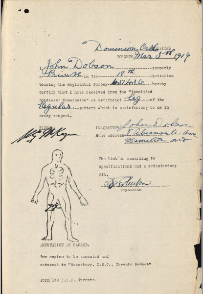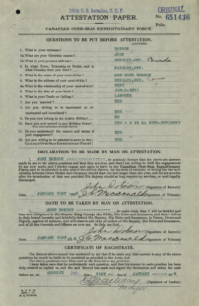 Family Search: When Private John Dobson was born on 1 January 1892, in Paisley, Bruce, Ontario, Canada, his father, Thomas W. Dobson, was 40 and his mother, Mary Ann Trotter, was 34. He married Laura Agnes Chapman on 6 June 1912, in Hamilton, Hamilton-Wentworth, Ontario, Canada. They were the parents of at least 2 sons. He lived in Bruce, Ontario, Canada for about 10 years and Chesley, Bruce, Ontario, Canada in 1916. He registered for military service in 1916. In 1916, at the age of 24, his occupation is listed as labourer in Chesley, Bruce, Ontario, Canada. He died in 1976, at the age of 84, and was buried in Starkvale Cemetery, Paisley, Bruce, Ontario, Canada.