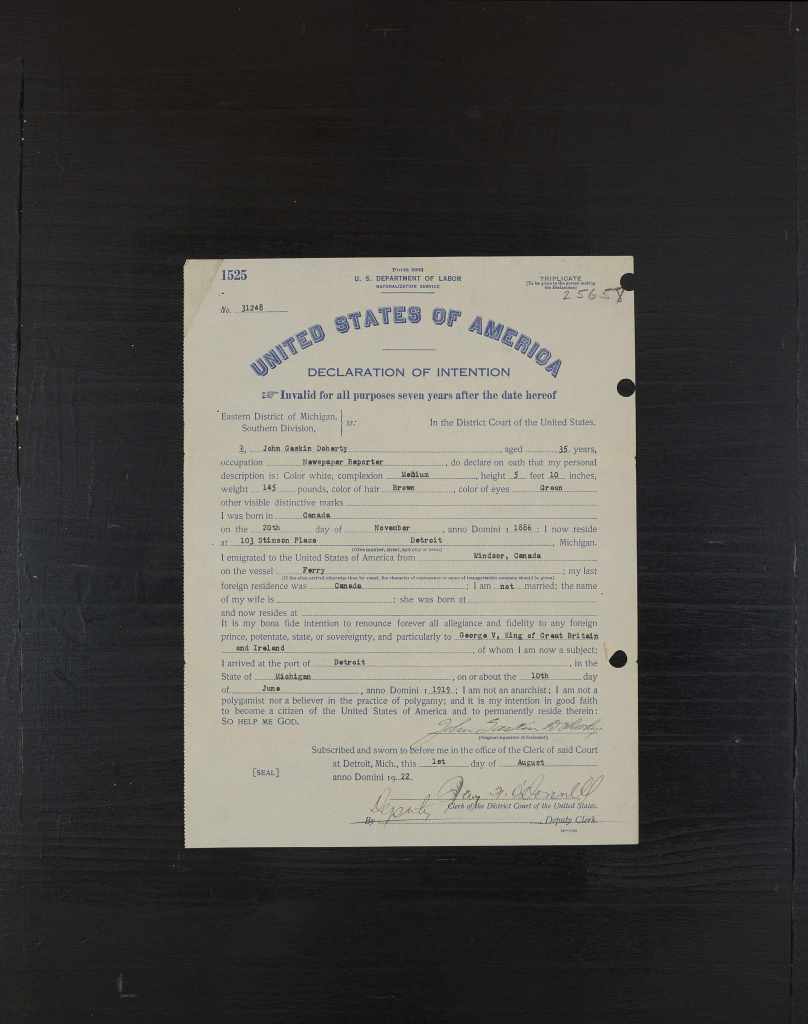Family Search: When Lieutenant John Gaskin Doherty was born on 20 November 1886, in St. Thomas, Elgin, Ontario, Canada, his father, William Burton Doherty, was 32 and his mother, Louisa Elizabeth Parish, was 32. He lived in Detroit Ward 10, Detroit, Wayne, Michigan, United States in 1940 and Detroit, Wayne, Michigan, United States for about 1 years. He registered for military service in 1916. In 1924, at the age of 38, his occupation is listed as financial editor, detriot news in Detroit, Wayne, Michigan, United States. He died on 10 December 1953, in Los Angeles, Los Angeles, California, United States, at the age of 67, and was buried in Glendale, Los Angeles, California, United States.