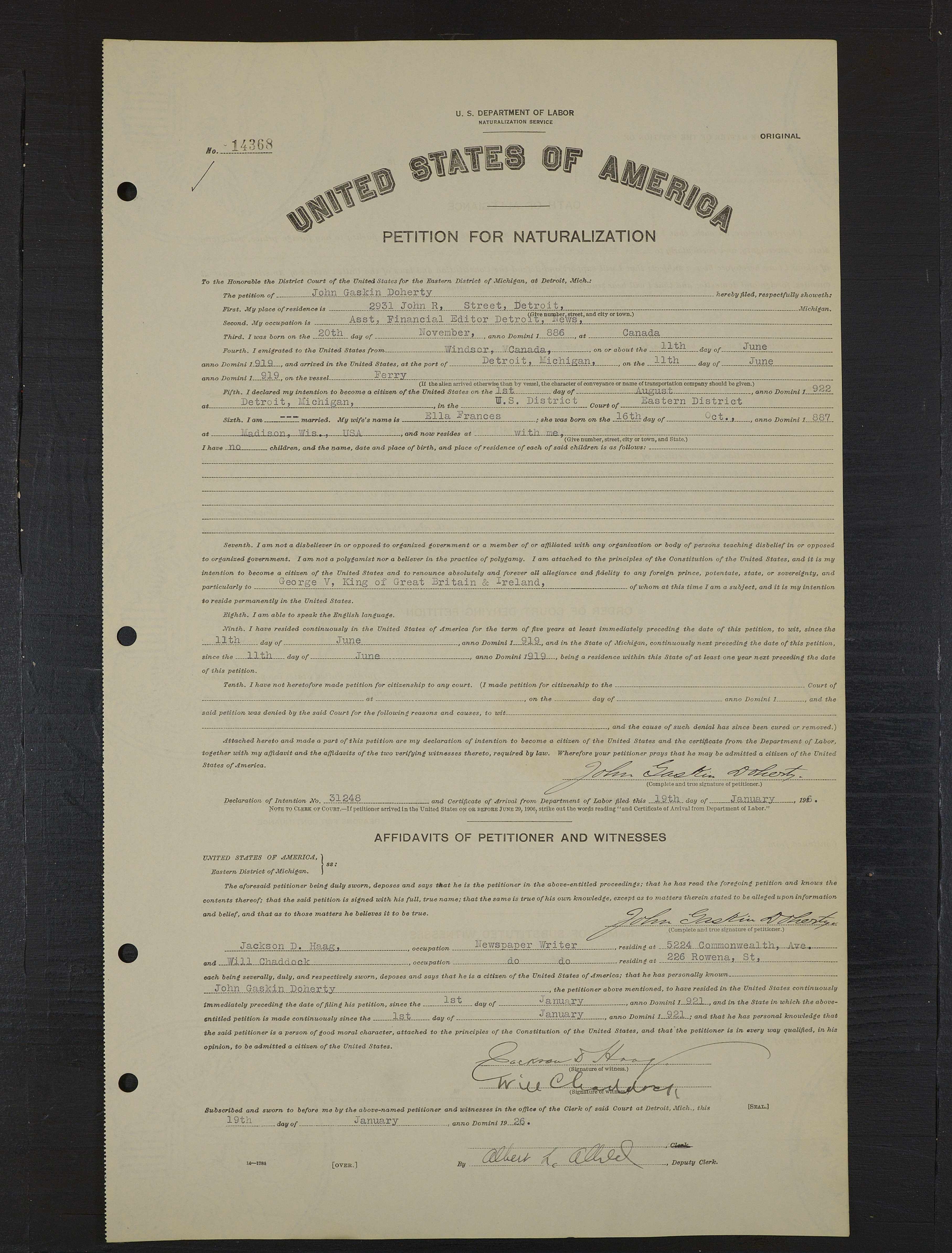 Family Search: When Lieutenant John Gaskin Doherty was born on 20 November 1886, in St. Thomas, Elgin, Ontario, Canada, his father, William Burton Doherty, was 32 and his mother, Louisa Elizabeth Parish, was 32. He lived in Detroit Ward 10, Detroit, Wayne, Michigan, United States in 1940 and Detroit, Wayne, Michigan, United States for about 1 years. He registered for military service in 1916. In 1924, at the age of 38, his occupation is listed as financial editor, detriot news in Detroit, Wayne, Michigan, United States. He died on 10 December 1953, in Los Angeles, Los Angeles, California, United States, at the age of 67, and was buried in Glendale, Los Angeles, California, United States.