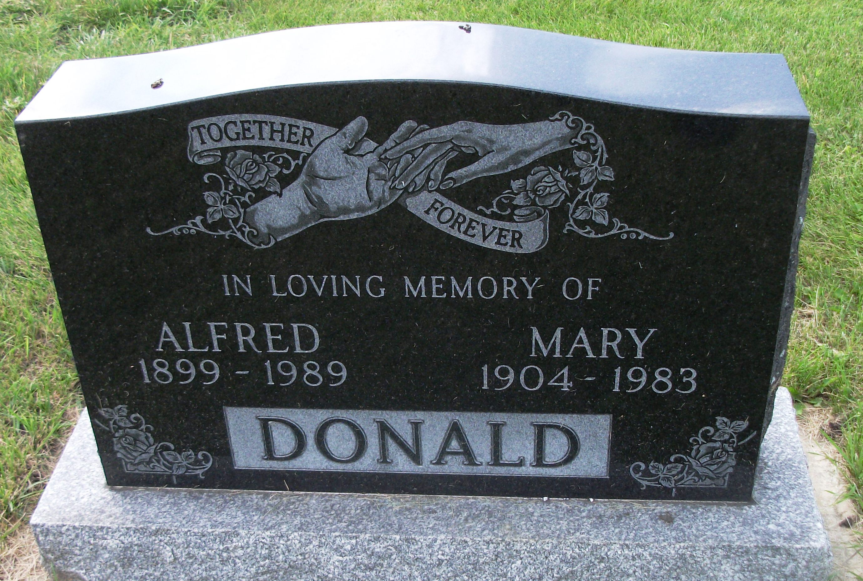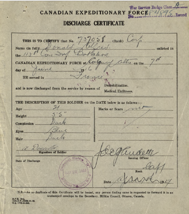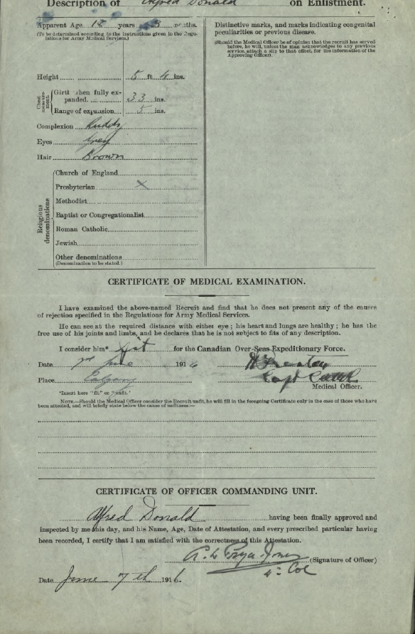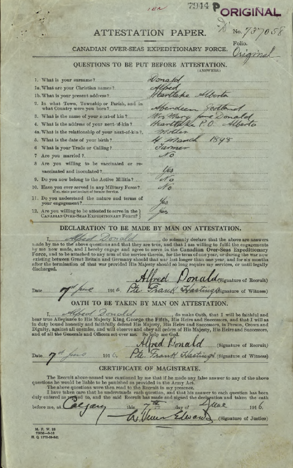 Family Search: When Corporal Alfred Donald was born on 4 March 1898, in Aberdeen, Scotland, United Kingdom, his father, Edward Burnet Donald, was 32 and his mother, Mary Jane Dunbar, was 30. He married Mary Keehn on 3 March 1921, in Great Falls, Cascade, Montana, United States. They were the parents of at least 1 son and 1 daughter. He lived in Acadia, Calgary, Alberta, Canada in 1926 and MD of Acadia No. 34, Alberta, Canada in 1931. He died in 1989, at the age of 91, and was buried in Fairview Cemetery, Lacombe, Alberta, Canada.